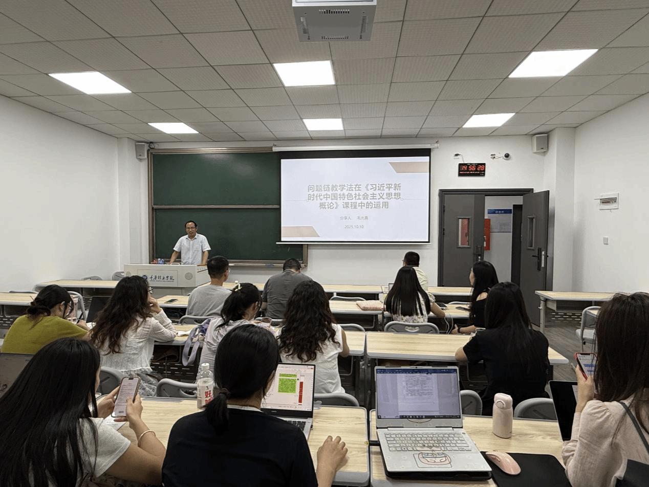 随后,毛光晨老师围绕“问题链教学法在《习近平新时代中国特色社会主义思想概论》中的运用” 展开交流。针对思政课“理论性强、学生认知具象化”的矛盾,他提出“四备”备课法——备教材、备时代、备学生、备自己,通过提炼 “真问题”、设计 “递进链”、实现 “价值升华”,将教材知识点转化为“现象-本质-规律”的层级问题。