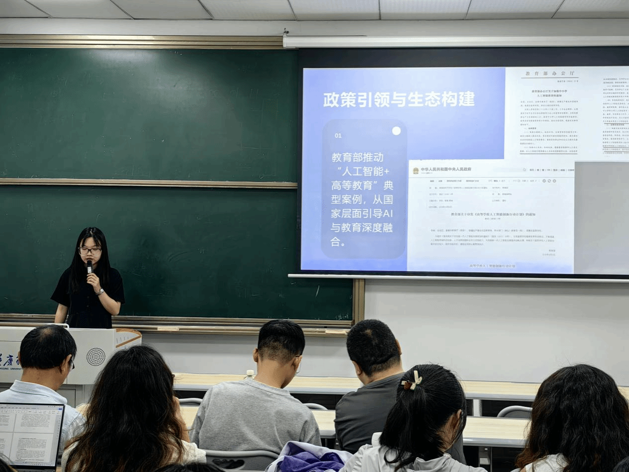 会上,杨佳欣老师以“AI引领课堂变革”为主题,结合高教国培专项培训内容,系统解读教育部《高等学校人工智能创新行动计划》等政策要求,重点分享AI在思政课 “课前-课中-课后”全流程的应用路径。