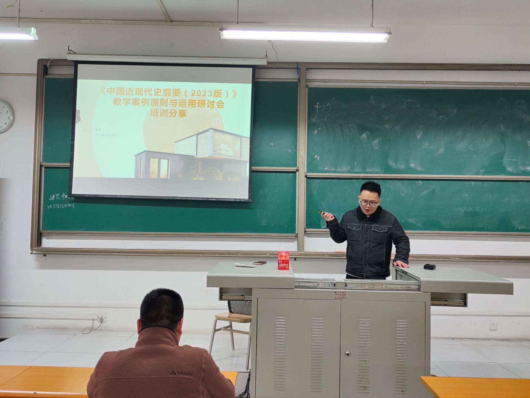 会上,曹席老师就寒假外出培训期间的“所听、所学、所思、所悟”向老师们进行了二次培训,给予教师专业引领。首先,曹老师介绍了此次培训的日程安排和基本情况,重点介绍浙江大学段治文教授和西南科技大学杨毅丰老师的授课。曹老师先向老师们分享了段治文教授的讲课内容,即“教学内容案例的选择与分析——《中国近现代史纲要》(2023版)教材第八、九章”,就段老师所选择的“新中国政权巩固”“一定要解放台湾”“过渡时期总路线”“三个世界的划分”“改革开放启动”“六次思想解放”“香港澳门问题”“先行为后立法”八个案例,作了简单介绍和说明,并提出就《中国近现代史纲要》讲课过程中围绕某一重要内容开展跨章节的“串联式”教学设想。