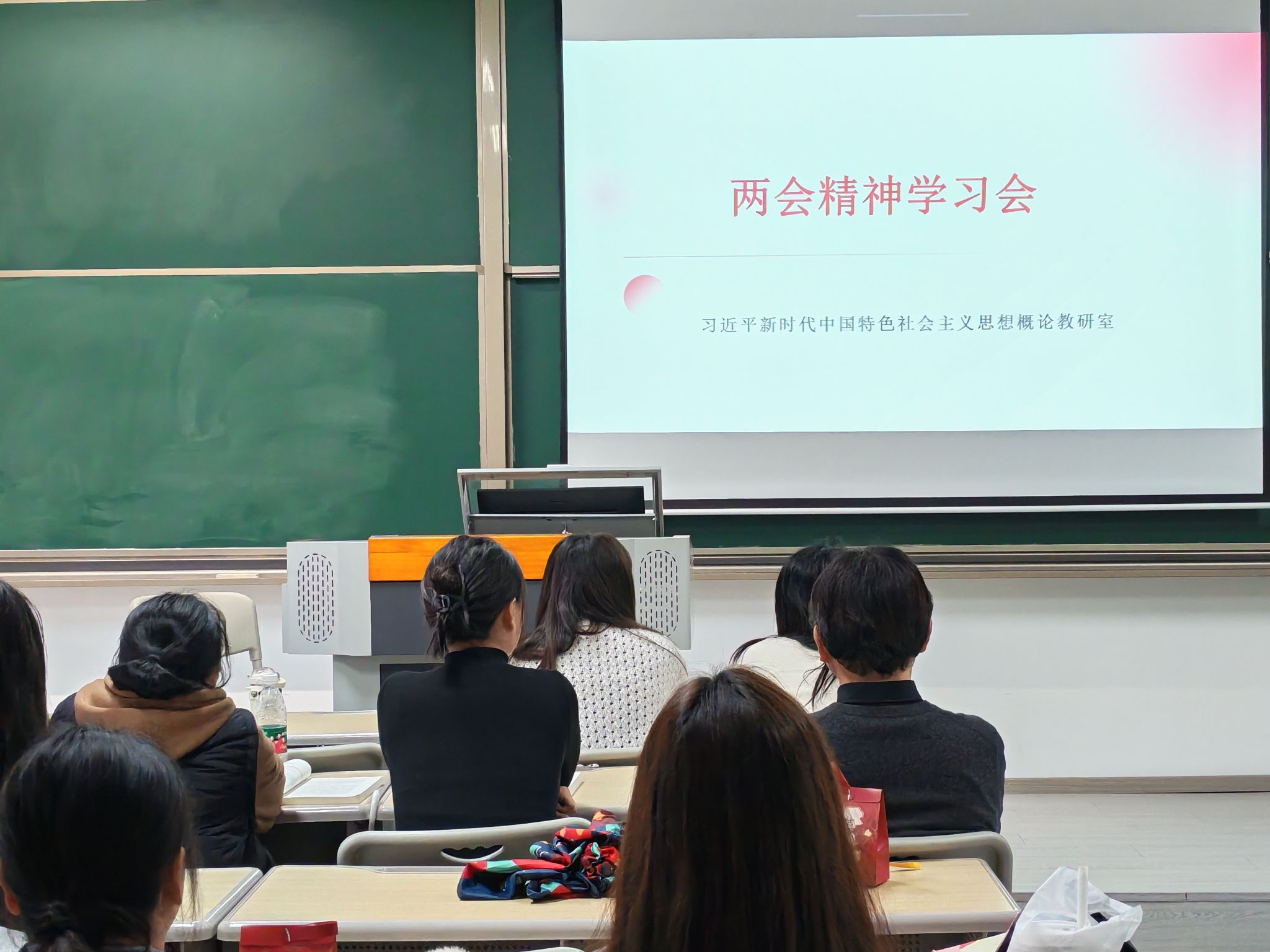 为深入贯彻落实全国两会精神,3月19日,习近平新时代中国特色社会主义思想概论教研室开展了主题为“学习两会精神,激发奋进力量”的专题学习会。此次学习会由教研室主任吴雪娇老师主持,教研室全体教师积极参与。