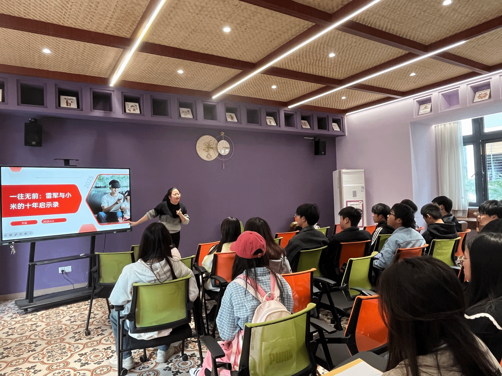 教师分享环节,卫峥妮老师分享了《任正非传》。卫老师从任正非的人生经历与《任正非传》的内容进行讲解。她指出,所谓华为精神则是:吃苦耐劳、敬业、艰苦奋斗的精神。其次华为非常崇尚“狼”,认为狼是企业学习的榜样,要向狼学习“狼性”。“学习”“创新”“获益”“团结”,用狼性文化来说,学习和创新代表敏锐的嗅觉,获益代表进攻精神,而团结就代表群体奋斗精神。正是由于任正非坚韧不拔的性格才造就了今天的华为,今天的华为精神也是对任正非性格的彰显。接着,罗老师向大家分享了《一往无前》,她指出在小米的创业历程中,雷军展现出了非凡的战略眼光和执行力。雷军提出的“专注、极致、口碑、快”的互联网思维,不仅颠覆了手机行业,也为我们提供了一种全新的思考方式。小米用互联网模式做硬件,用性价比打破行业壁垒,用粉丝文化重塑用户关系,这些来自于跨界思维碰撞的创新举措令人印象深刻。罗老师总结到:“成功不是偶然,雷军的成功不是偶然,而是持续努力和不断学习的结果。”