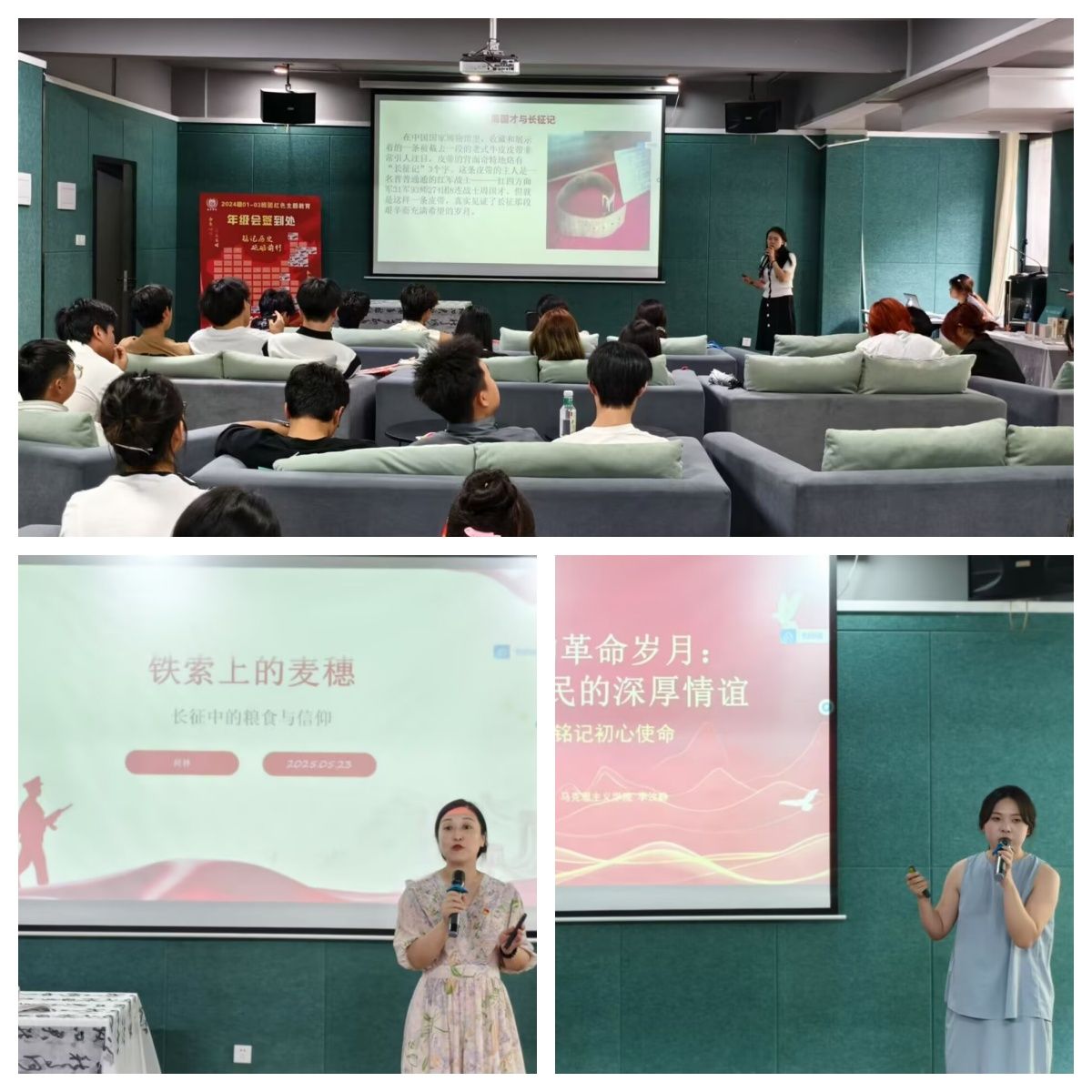 待同学们坐好,来自马克思主义学院的三位教师以“食物里的精神密码”为线索进行了分享。唐菊相老师讲述了炊事班长周国才珍藏半截皮带的往事。她谈到:“当战士们嚼着草根说‘这是革命甘蔗’时,食物就成了信仰的载体。”何林老师则用3D投影重现泸定桥场景,解密了“铁索麦穗”的深层含义,指出:“13根铁链承载的不仅是突击队员,更是苏区人民省下的4000斤麦种,这是军民鱼水情的物化象征。”李汶静老师展示了毛主席延安时期与老乡换窝窝头的书信影印件时,让现场同学极为震撼,来自智能工程学院的王同学在研学手册上记录下来:“原来领袖的‘食物外交藏着’不拿群众一针一线'的密码。”