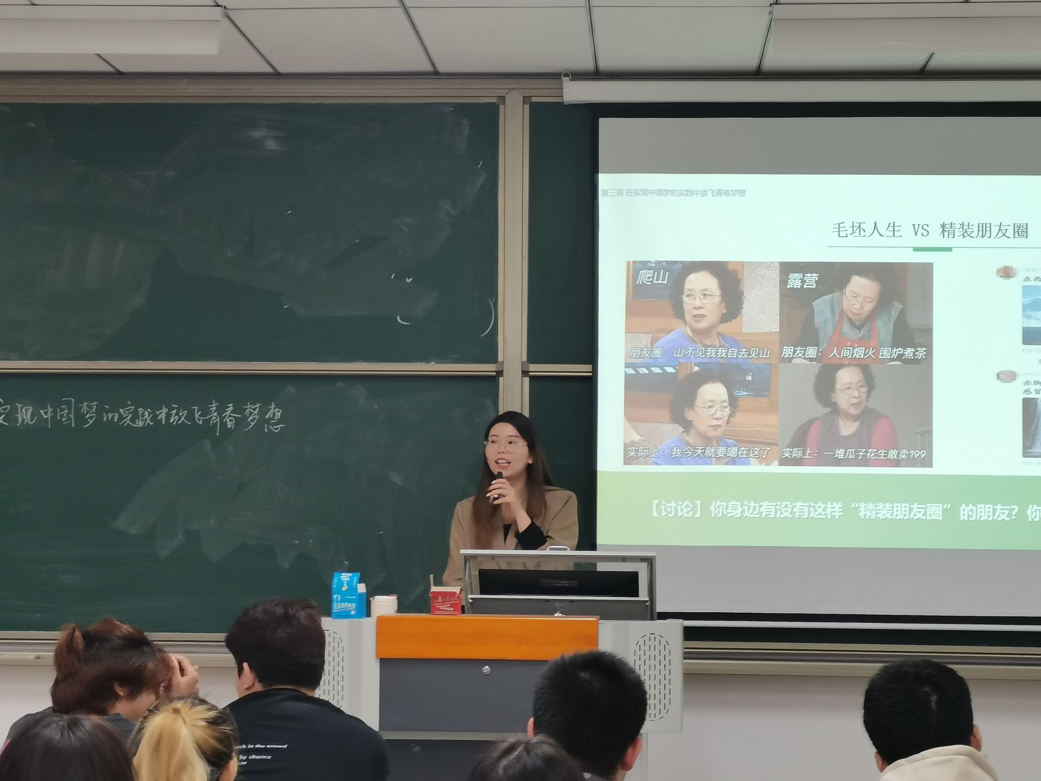 本次课由马克思主义基本原理教研室罗涵老师主讲,内容为《思想道德与法治》第二章第三节“在实现中国梦的实践中放飞青春梦想”。罗老师着重为学生讲授了“理想与现实的辩证关系”以及“个人理想与社会理想的有机结合”等内容,她根据教学内容的需要,对教材内容进行了适当拓展,并巧妙地引导学生进行思考,力求使学生在课堂上获得更多的自主学习体验。