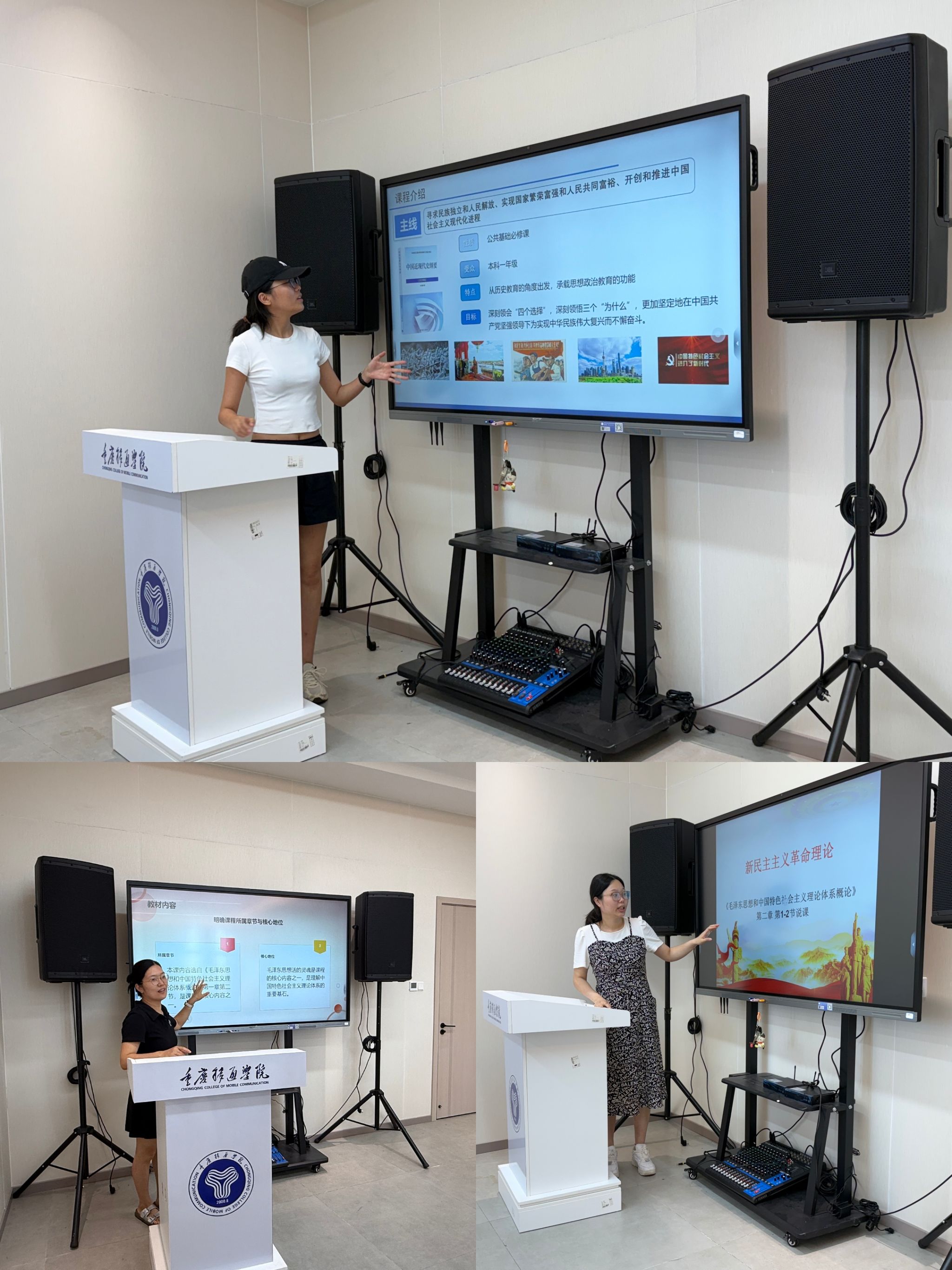活动现场,多位教师依次登台说课。在《毛泽东思想和中国特色社会主义理论体系概论》课程展示环节,高齐和张立影两位教师从课程主线切入,系统梳理教材框架,详细阐述了马克思主义中国化理论与课堂实践的融合路径。简云丹聚焦“新民主主义革命”章节,精准剖析教学重难点;杨丽娟则深入解读“毛泽东思想活的灵魂”核心要义,分享了理论教学与价值引领有机结合的宝贵经验。