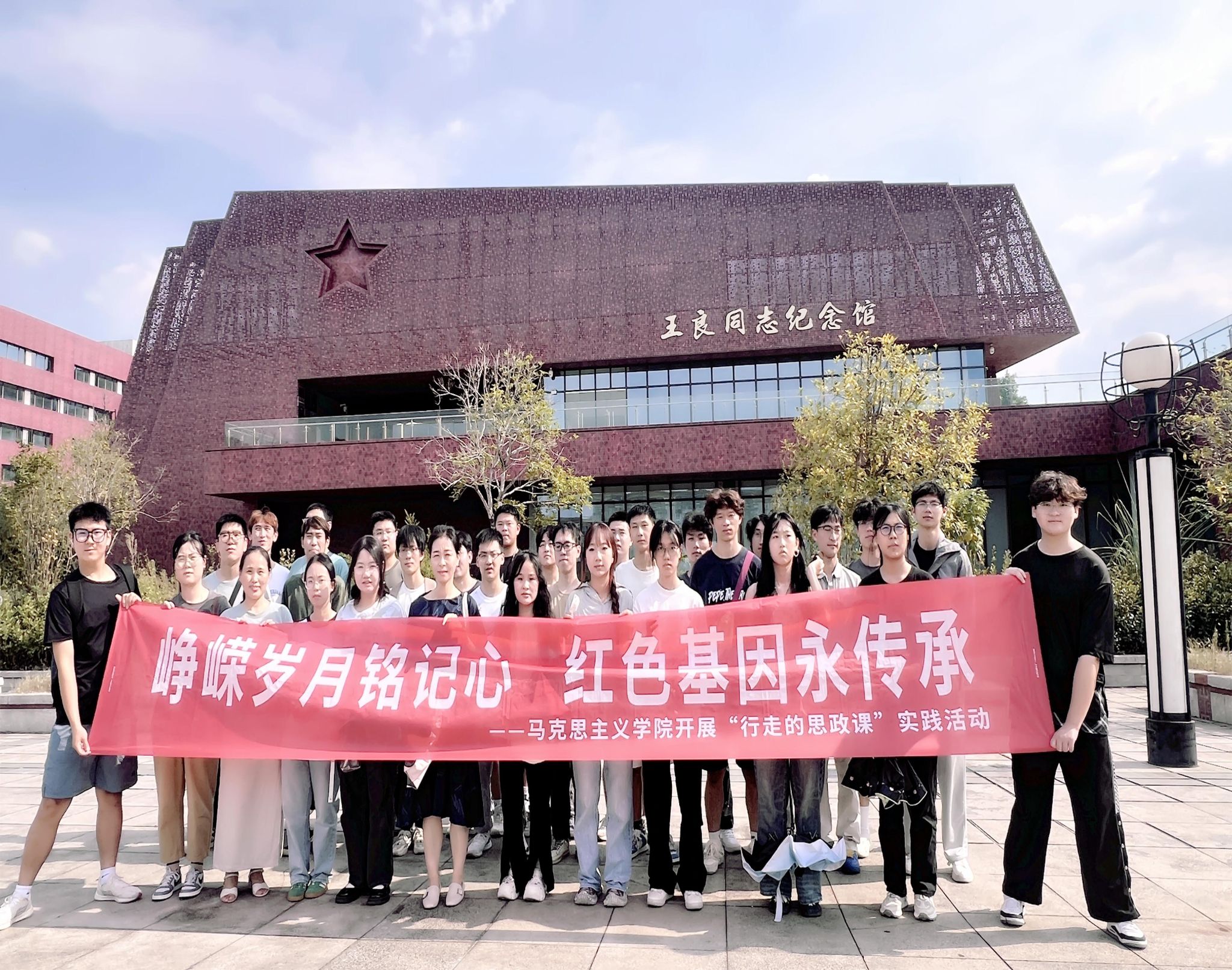 炎阳炽烈仲秋异,热浪滚滚似盛夏。为深入贯彻落实党的二十届三中全会精神,深切缅怀革命先烈,铭记峥嵘岁月,传承红色基因,弘扬革命精神,进一步落实和开展马克思主义学院的实践教学活动,拓宽立德树人育人途径,把教学空间和资源拓展到广阔的社会生活中去,丰富大学生的实践学习,2024年9月20日下午,马克思主义基本原理教研室陈静、潘家玲、曾宁栖三位老师,组织綦江校区30余名学生,赴王良纪念馆开展了一场别开生面的“行走的思政课”实践活动。