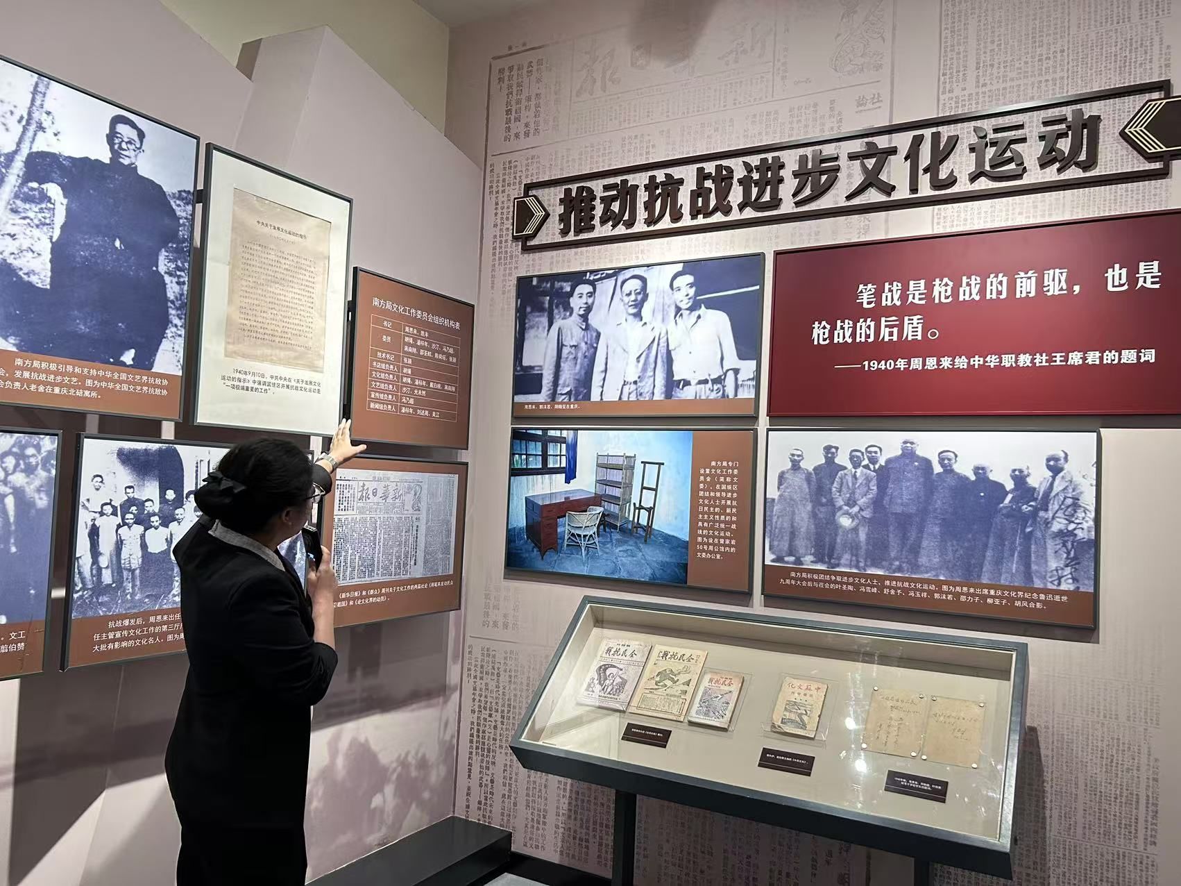 嘉陵江畔,红岩革命纪念馆巍然矗立,象征着老一辈无产阶级革命家、无数革命志士用奋斗和鲜血凝结的“红岩精神”永放光芒。“千秋红岩——中共中央南方局历史陈列展览”正在举行。同学们先后步入展厅参观学习。展览由共赴国难、雾都明灯、抗战号角等10个部分组成,600多张珍贵历史图片、300余件重要文物和大量影像资料全景展示着南方局波澜壮阔的奋斗历程。在一张张历史图片、一件件文物面前,现场师生不时驻足凝视,听取讲解、询问情况,重温烽火连天的峥嵘岁月,感受革命先烈坚定的理想信念和浩然正气。