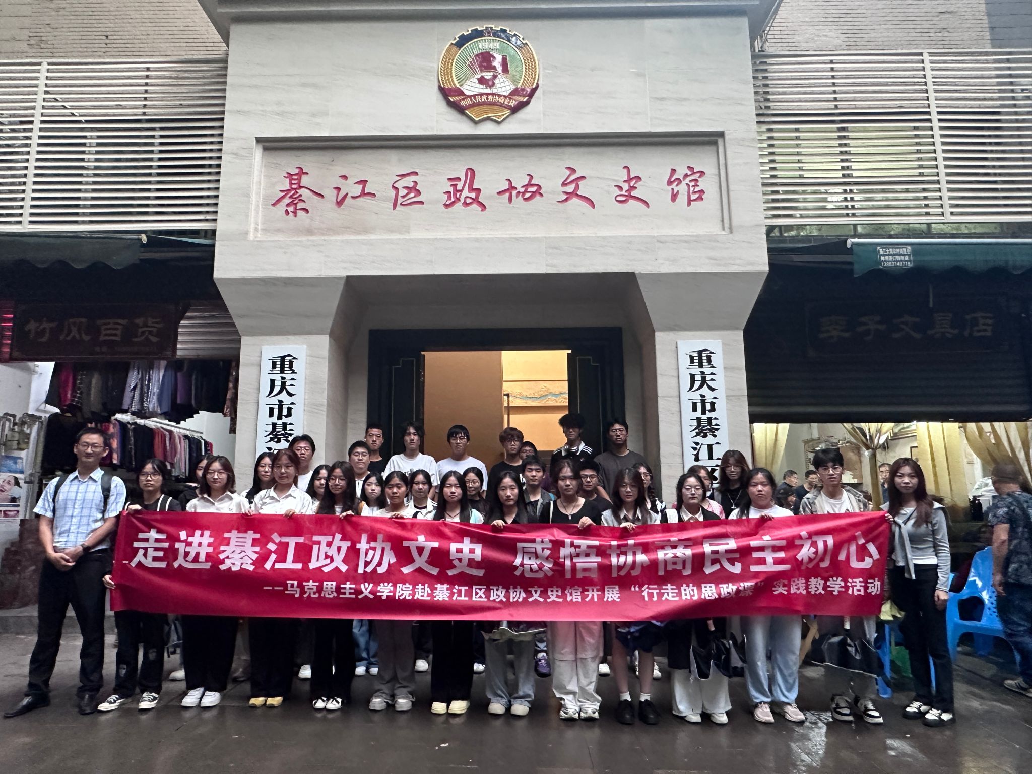 在讲解员带领下,同学们沿着“政协概况”“履职成果”“文史研究”“委员风采”等展区有序参观。在承载记忆的政协提案原件、调研手稿前,大家驻足细观,聆听讲解员讲述政协委员围绕綦江工业发展、乡村振兴、民生改善建言献策的故事;在展示地域文化的老照片、民俗展品旁,同学们积极提问,深入了解綦江的历史变迁与独特风情,沉浸式感受人民政协制度的优势与地方发展的脉动。