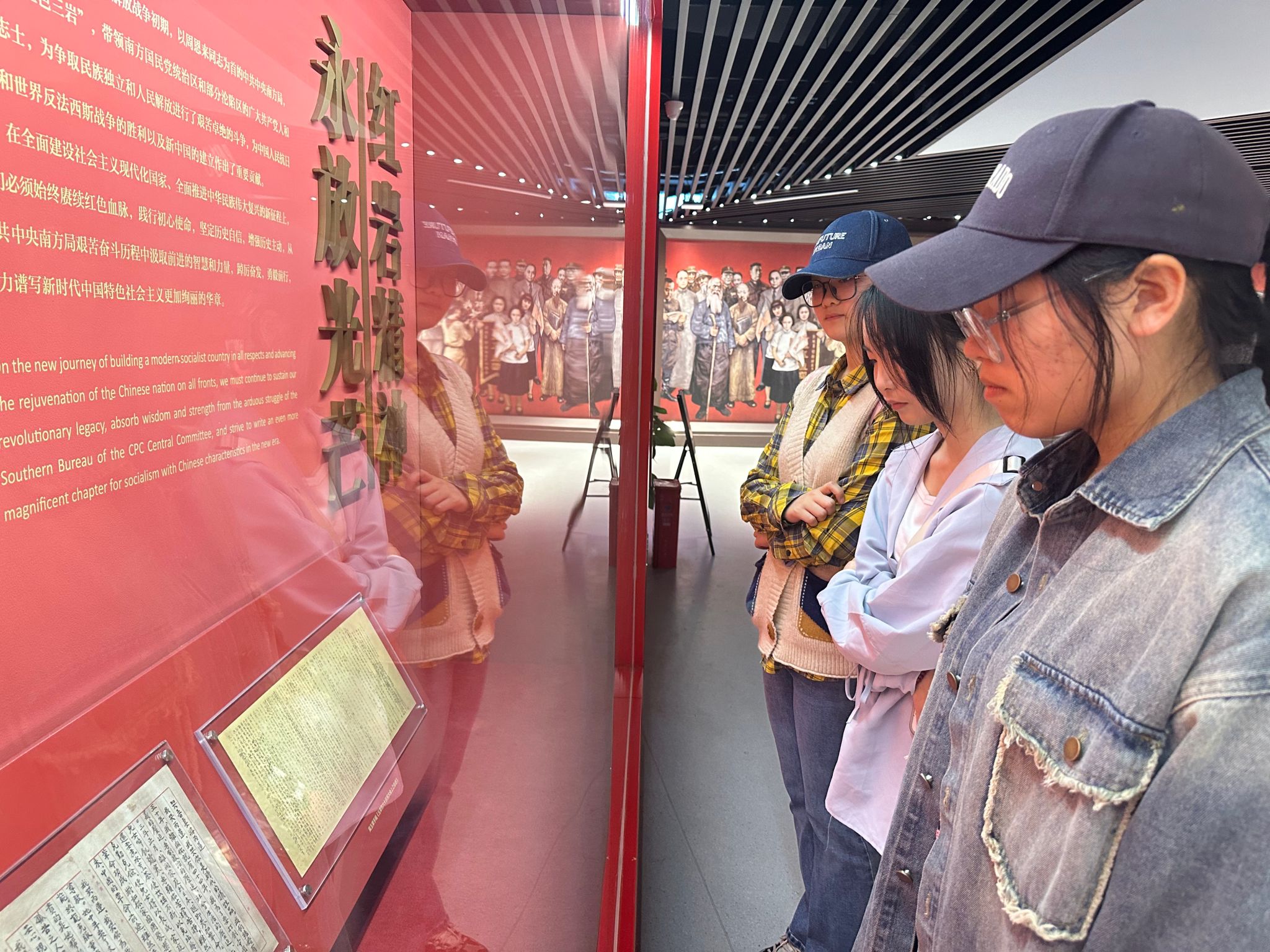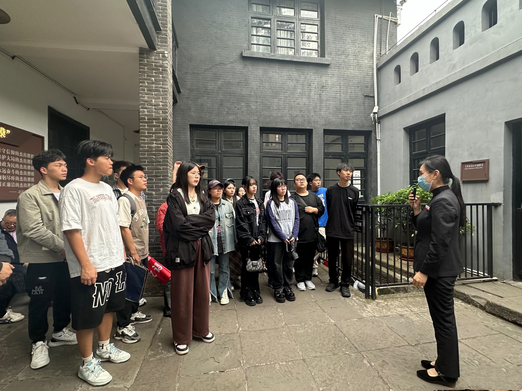 进入公馆一楼,大厅墙上悬挂着中共南方局组织成员图,旁边电话上注释着“皖南事变”。再往里走,深色木质小床、老旧的风扇和热水瓶、一张张历史照片、一件件伟人遗物、一份份珍贵手稿……仿佛再现了70多年前周总理和董必武等老一辈革命家与党内外人士商谈时事的场景。老一辈革命家简单朴素的生活作风、求真务实的工作作风,透过一件件文物,教育着师生们要做一个勤俭节约、艰苦奋斗的人,要做一个不在乎个人物质、在乎民族兴亡的人。老一辈革命家深厚的家国情怀和崇高的精神境界在讲解员的娓娓道来中,震撼着师生们的心灵,每一个人都感受到了共产党人坚如磐石的信仰力量,考察在不知不觉中进入尾声。