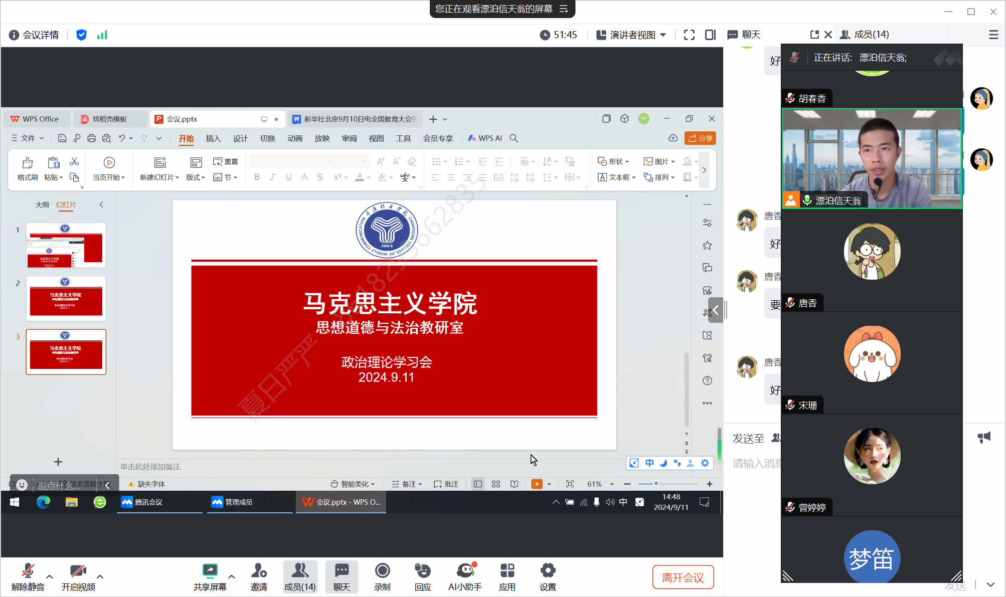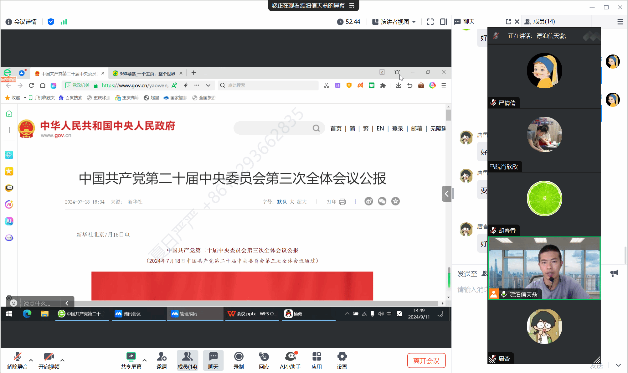 9月11日下午,马克思主义学院思想道德与法治教研室组织全体教师开展了对党的二十届三中全会精神的深入学习。党的二十届三中全会是在我国全面建设社会主义现代化国家新征程、向第二个百年奋斗目标进军的关键时刻召开的一次重要会议,对于进一步全面深化改革、推进中国式现代化具有重大而深远的意义。作为高校思政课教师,准确理解和把握会议精神,对于引导学生树立正确的世界观、人生观、价值观以及增强学生的政治素养至关重要。