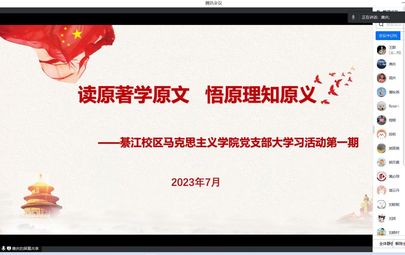 为深入开展学习贯彻习近平新时代中国特色社会主义思想主题教育,全面学习领会习近平新时代中国特色社会主义思想的科学体系、精髓要义、实践要求。2023年7月28日,綦江校区马克思主义学院党支部开展主题为“读原著学原文,悟原理知原义”的大学习活动,会议由唐孝庆老师主持。本次活动旨在提高教师的学术素养和专业水平,促进教学内容的深入理解和有效传达。