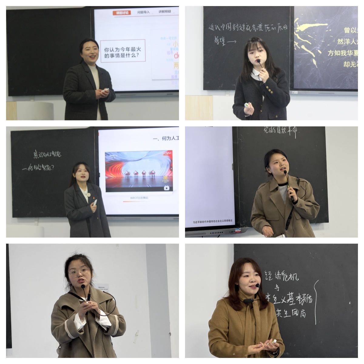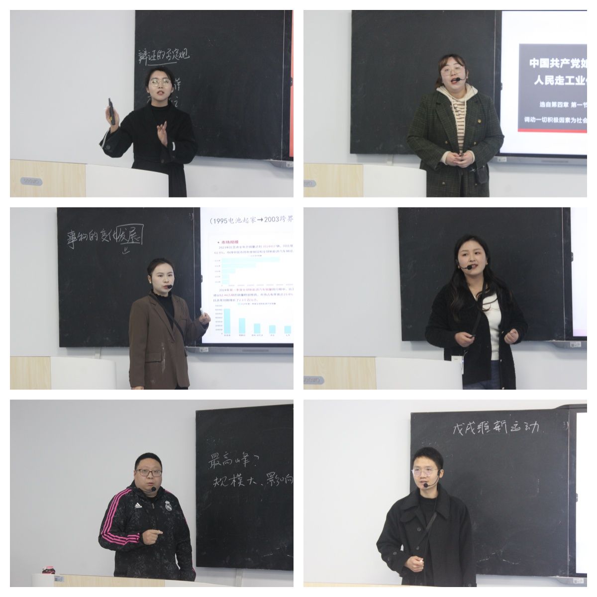 在比赛过程中,每位参赛教师都做了精心准备,教学环节设计精巧,教学方法丰富多样,教学方式各具特色。岳源老师以饱满的热情、富有感染力的语言,深刻诠释了“人民!何以人民”,引发在场所有人强烈的情感共鸣;杨佳欣老师通过运用AI将历史人物变得生动,讲述了“近代中国封建社会衰落的三维探析”;袁明君老师通过讲述真实且触动人心的故事,生动展现了“中国共产党如何带领人民走工业化道路”,让大家在故事中感悟国家发展的历程;李潇潇老师从“一枚巡飞弹里的否定与新生”实际案例入手,深入浅出地讲解“辩证的否定观”,使大家切实感受到理论知识与生活的紧密联系;严倩倩老师从马克思主义基本观点出发,结合当下热点话题“AI”,引导大家进行深入思考与探讨,培养大家的批判性思维与理论应用能力…… 老师们纷纷积极创新教学手段,精准把握知识要点,不仅彰显出扎实深厚的教学功底与风格各异的教学特色,更全方位展现了马克思主义学院青年教师的卓越教学风采,赢得了在场观摩教师们的高度赞誉与热烈掌声。