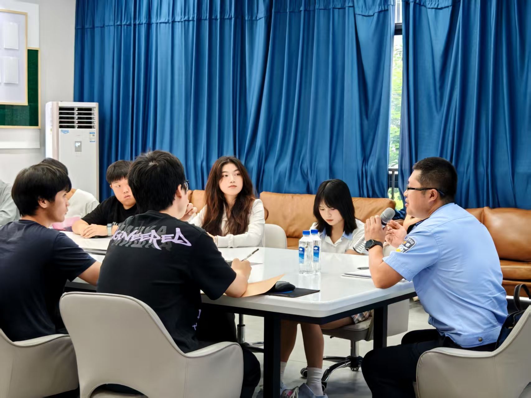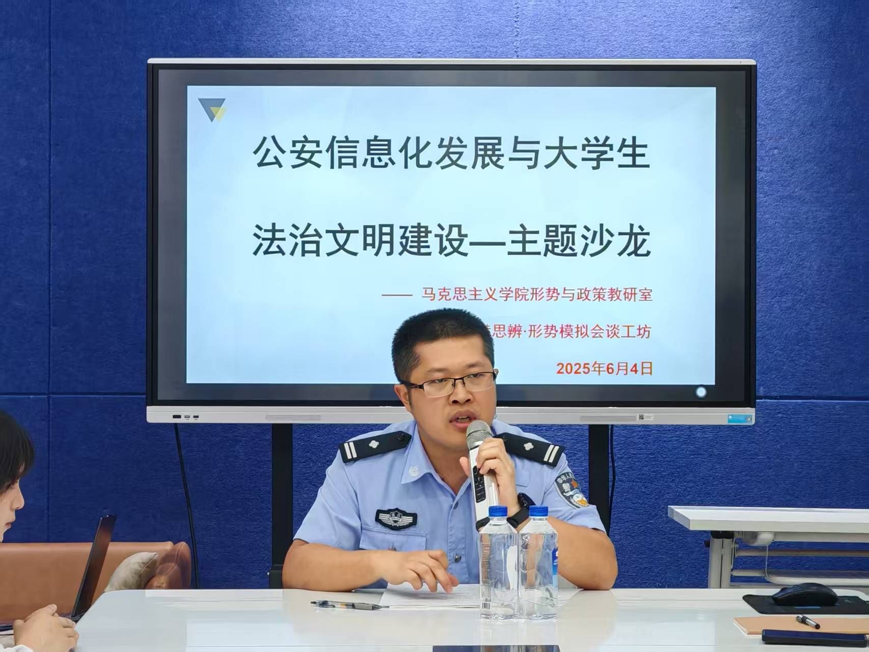 为深入推进法治校园建设,增强大学生的法治观念和法律意识,引导青年学生积极投身法治实践,2025年6月4日,马克思主义学院(綦江校区)形势与政策教研室特邀重庆市公安局监管总队信息化建设科武玉杰警长,在綦河书院励行·会客厅举办“公安信息化发展与大学生法治文明建设”主题沙龙活动。本次活动由形势与政策教研室贺铭钰老师主持,教研室教师张立影、郝月霜出席,纵横思辨·形势模拟会谈工坊30余名学生代表参加。