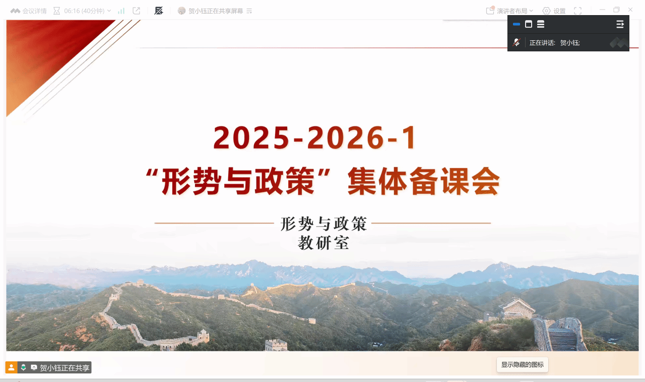 为强化教师协作交流,明确新学期《形势与政策》课程教学方向,切实提升思政课教学质量,2025年9月24日,马克思主义学院(綦江校区)通过腾讯会议组织召开集体备课会。会议由贺铭钰、王郡老师共同主持,綦江校区《形势与政策》课程组全体教师参会。