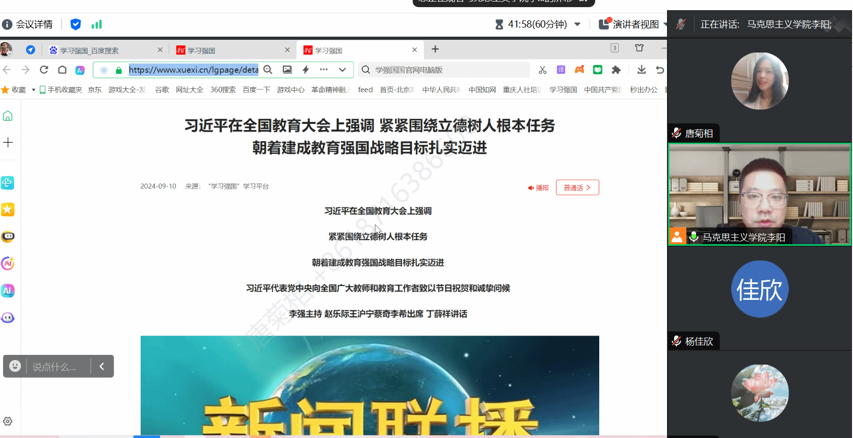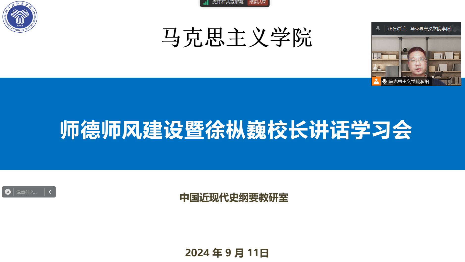 为深刻领会并全面贯彻“习近平总书记在全国教育大会上的重要讲话”精神,积极响应学校要求,学习“徐枞巍校长在泰山科技学院重要讲话”,中国近现代史纲要教研室于9月11日14时40分相聚云端,精心组织了一场以“铭初心强师德 铸师魂展担当”为主题的师德师风暨战略学习会。此次活动旨在通过深入学习与交流,进一步巩固和提升青年教师队伍的整体素质与道德风貌,为开展好立德树人工作奠定坚实基础。