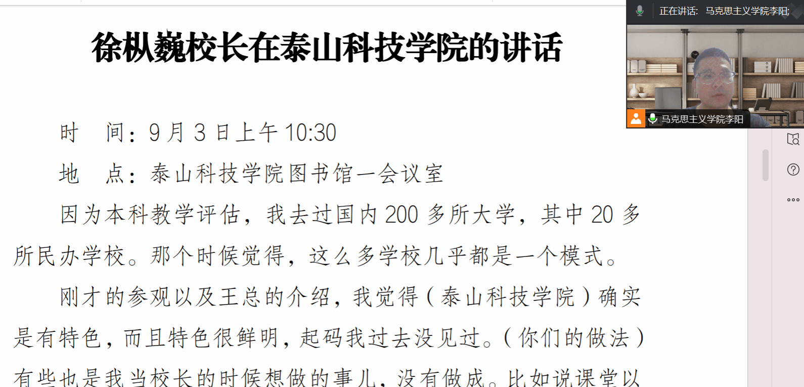 随后,李老师又引领全体教师深入学习了《徐枞巍校长在泰山科技学院的讲话》内容,特别围绕“徐校长针对学校建设提出的具体要求与美好愿景”分享了学习心得。他鼓励每位教师不仅要深刻理解徐校长的讲话精神,更要将其内化于心、外化于行,自觉践行学校的办学理念,持续锤炼教学水平、提升科研技能,以高尚的师德情操、精湛的教学技艺、无私的奉献精神,成为学生成长道路上的引路人和楷模。李老师还借用习总书记的讲话,特别强调了“经师”与“人师”的统一,倡导教师们不仅要精通专业知识,更要注重人格魅力的塑造,以自身的良好品行影响学生,成为学生全面发展道路上的“大先生”。
