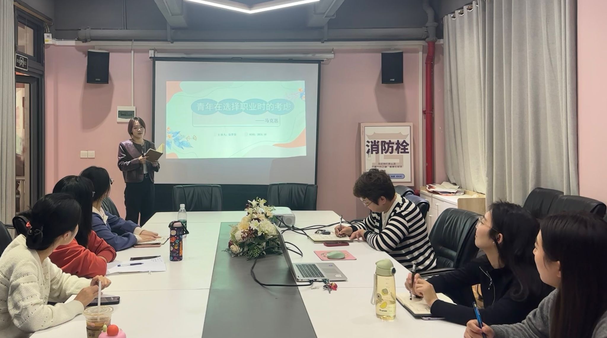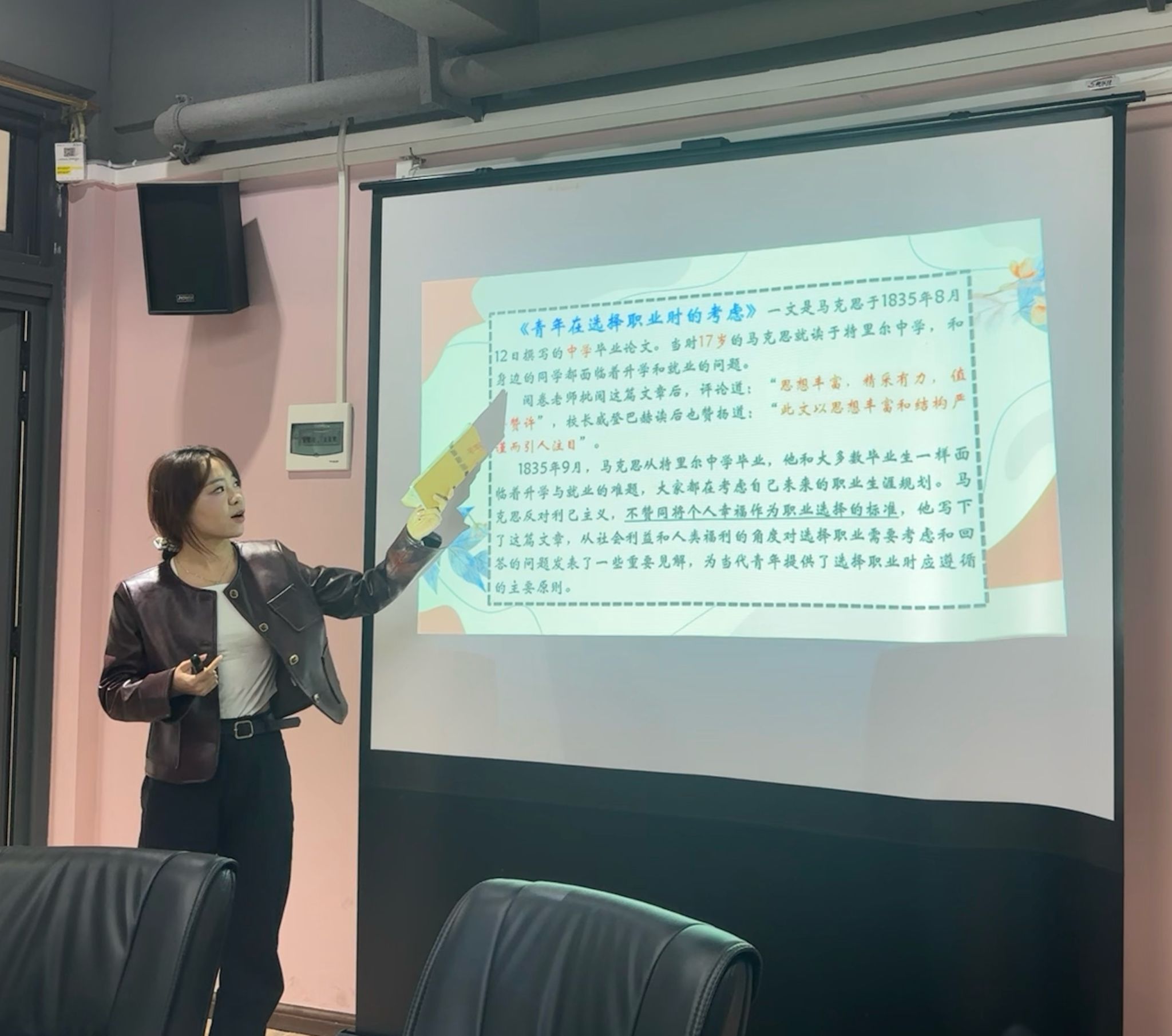 徐梦笛老师从写作背景出发,分别通过文本精读、文本价值等多个方面,向老师们介绍了马克思作为伟大的思想家和革命导师在中学毕业时期写下的论文——《青年在选择职业时的考虑》,这篇文章深刻阐述了青年选择职业时应该思考的各种因素和遵循的重要原则,马克思提出青年要为人类幸福而劳动,献身于自己的职业理想。正是源于对自身职业初心使命的坚守、践行和不懈奋斗,成就了马克思伟大的一生。通过分享后的沟通和交流,老师们纷纷表示这篇文章具有重要的当代价值,作为思政课教师,在教学过程中针对新时代青年应该如何选择职业等问题,这篇文章无疑给出了最好的参考答案,对新时代青年树立科学的择业观具有重要的启示价值。
