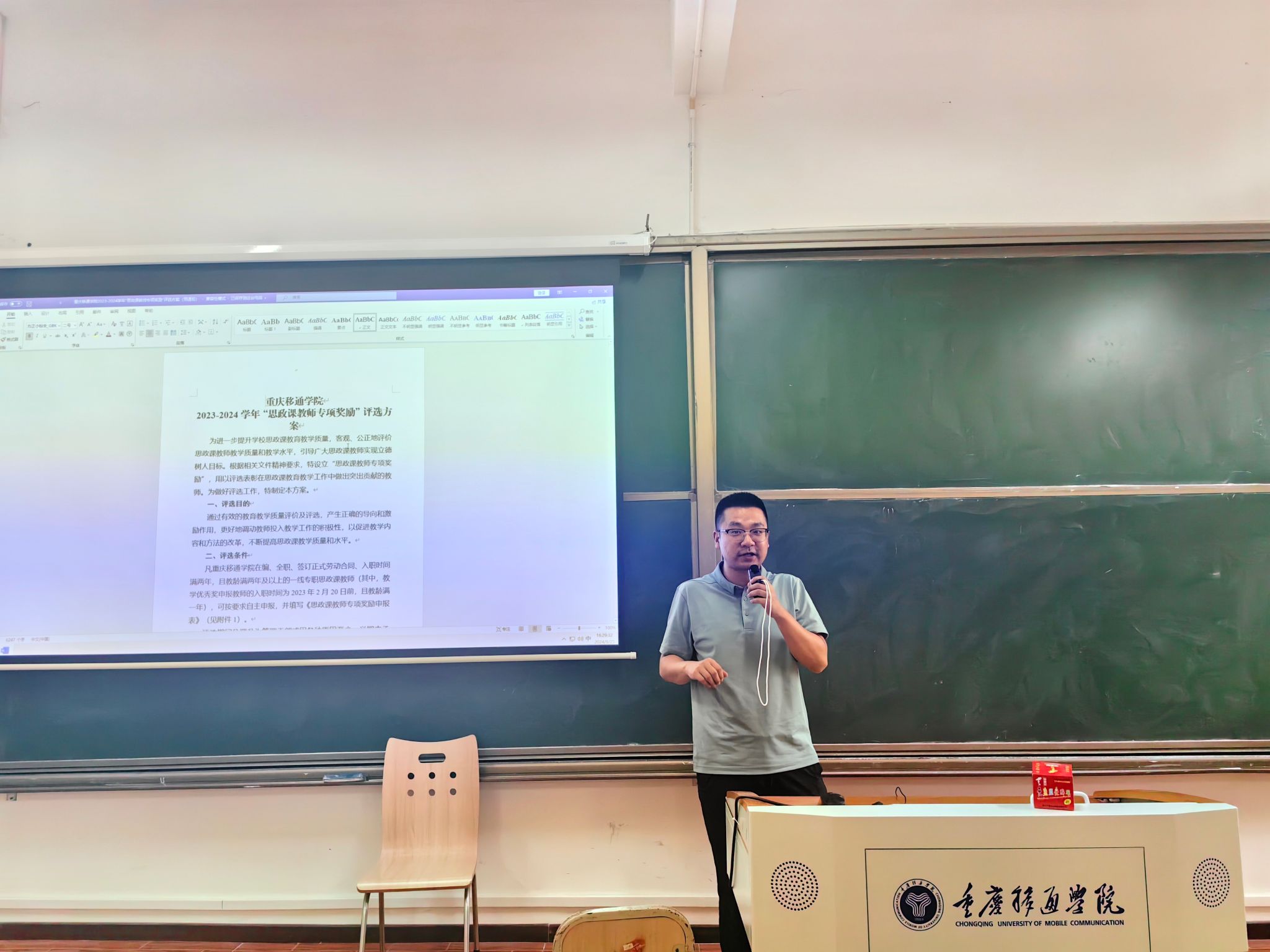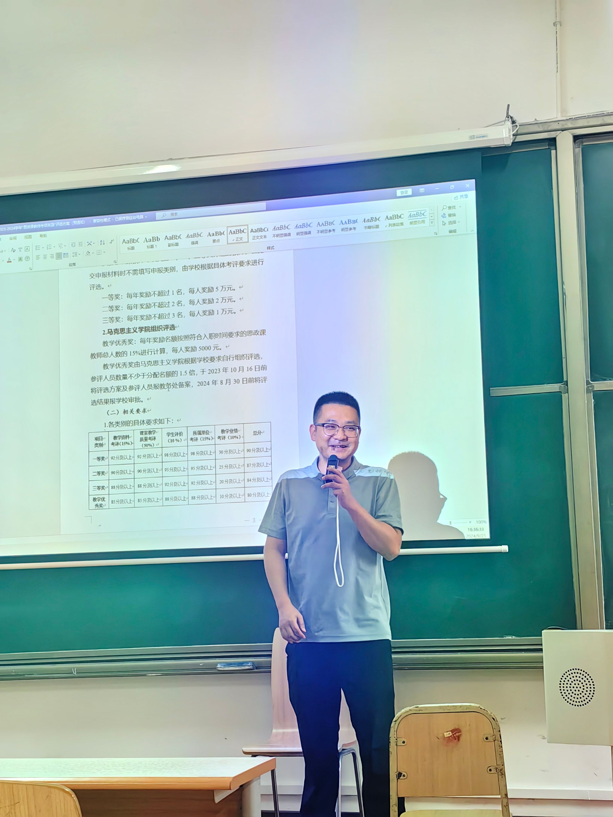 2024年9月25日14点30分,马克思主义学院中国近现代史纲要教研室举办了一场特别的分享会,由教研室主任、2023-24学年思政课教师专项奖励一等奖获得者李阳老师针对思政课教师专项奖励评选进行了全面解读。此次活动旨在为进一步激发教师们教学提质、创新改革的动力,为教师们牟定目标、努力进取、提振信心、参与评选提供指导。