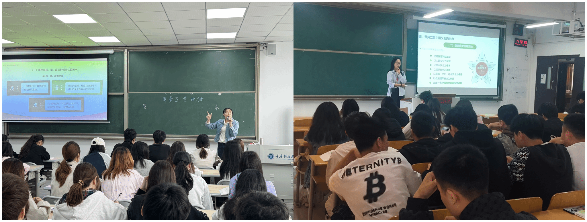曾婷婷老师的授课内容是《马克思主义基本原理》中第一章第二节的“质量互变规律”。她以生动的案例和深入浅出的讲解,引领同学们逐步探索这一哲学原理的深刻内涵,同时还带领同学们一起探讨了质量互变规律所具有的重要方法论意义,使同学们对这一哲学原理有了更加全面和深入的理解;何颖老师的授课内容为《马克思主义基本原理》第一章第二节“联系和发展的基本环节”。她首先带着同学们复习了唯物辩证法的总特征,即联系和发展的相关内容,接着通过如何抓住世界的“网上纽结”这个问题导入课堂,结合相关案例对联系和发展五大基本环节的内涵、关系和方法论进行了详细的讲解,并通过雨课堂让学生做题来巩固所学知识;郭路平老师讲授的是《思想道德与法治》第三章第三节“让改革创新成为青春远航的动力”。她深入浅出地阐明了改革开放是当代中国的显著特征、改革创新是新时代的迫切要求、大学生要争做改革创新的生力军等问题,用与学生生活贴近的一系列案例引发学生深入思考,鼓励同学们积极参与课堂讨论并发言,以此培养学生批判性思维和解决问题的能力。
