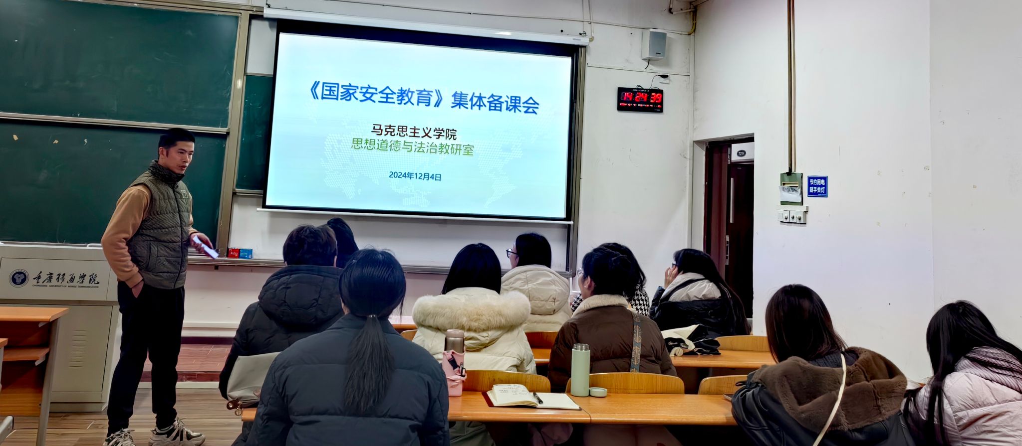 国家安全是民族复兴的根基,维护国家安全是全体中国公民的共同责任。为进一步学习贯彻习近平总书记关于总体国家安全观的重要论述,做好《国家安全教育》教学工作,2024年12月4日下午,思想道德与法治教研室的老师们在7201教室进行了《国家安全教育》集体备课。本次活动由思想道德与法治教研室杨勇老师主持,教研室全体教师参加。