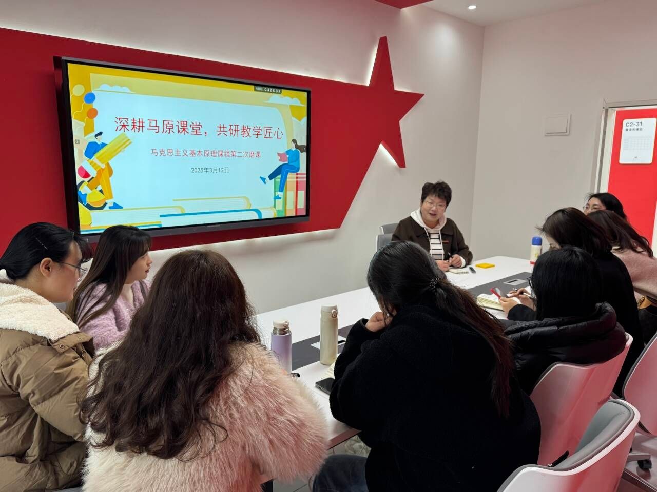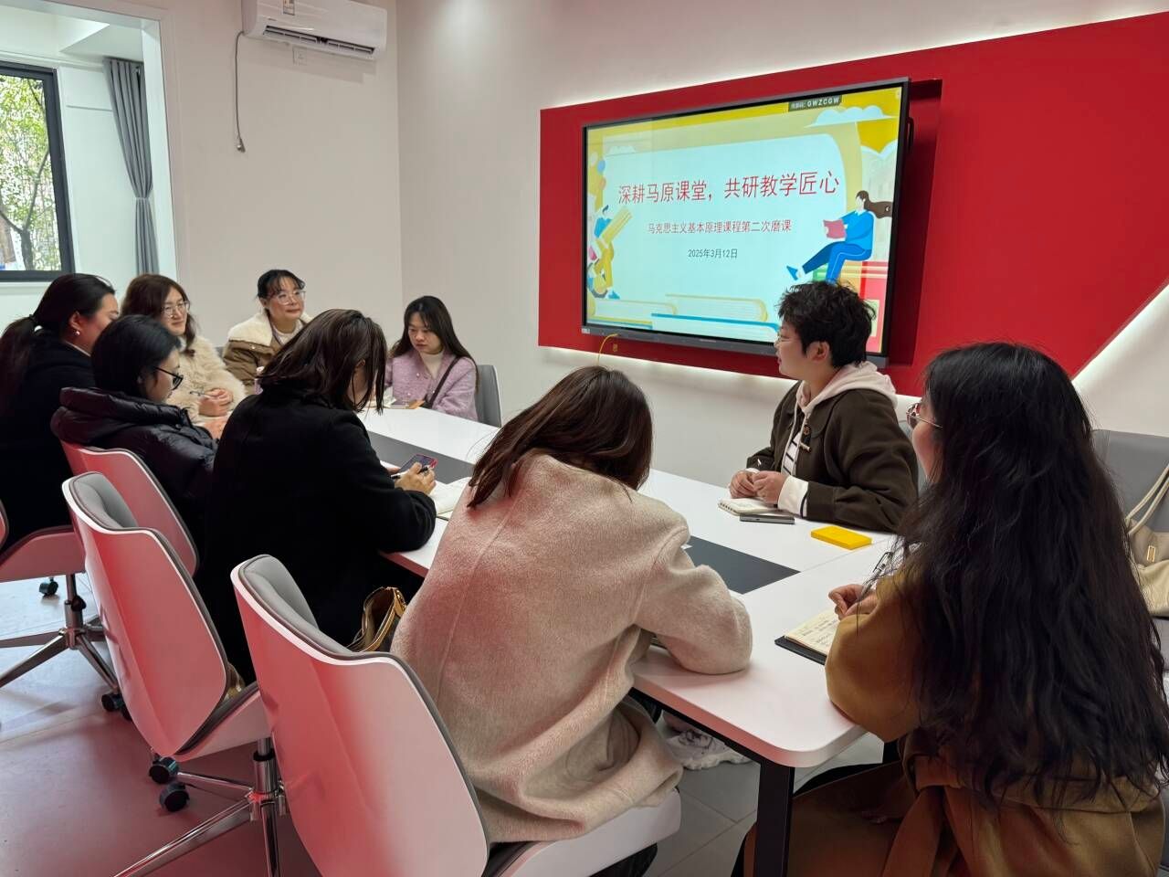 在深化教育教学改革、提升课程质量的大背景下,为全面提升思政课教师专业素养与课堂教学实效,持续推进新时代思政课改革创新向纵深发展,3月13日下午16:00,马克思主义学院《马克思主义基本原理》课程组开展了第二次集体磨课会。本次会议由宋珊老师主持,课程组全体老师参加,主要聚焦于课程大纲的精细化打磨,旨在通过集体智慧与专业探讨,进一步优化课程设计,确保教学内容的科学性、时代性与针对性,为学生提供更加高质量的学习体验。