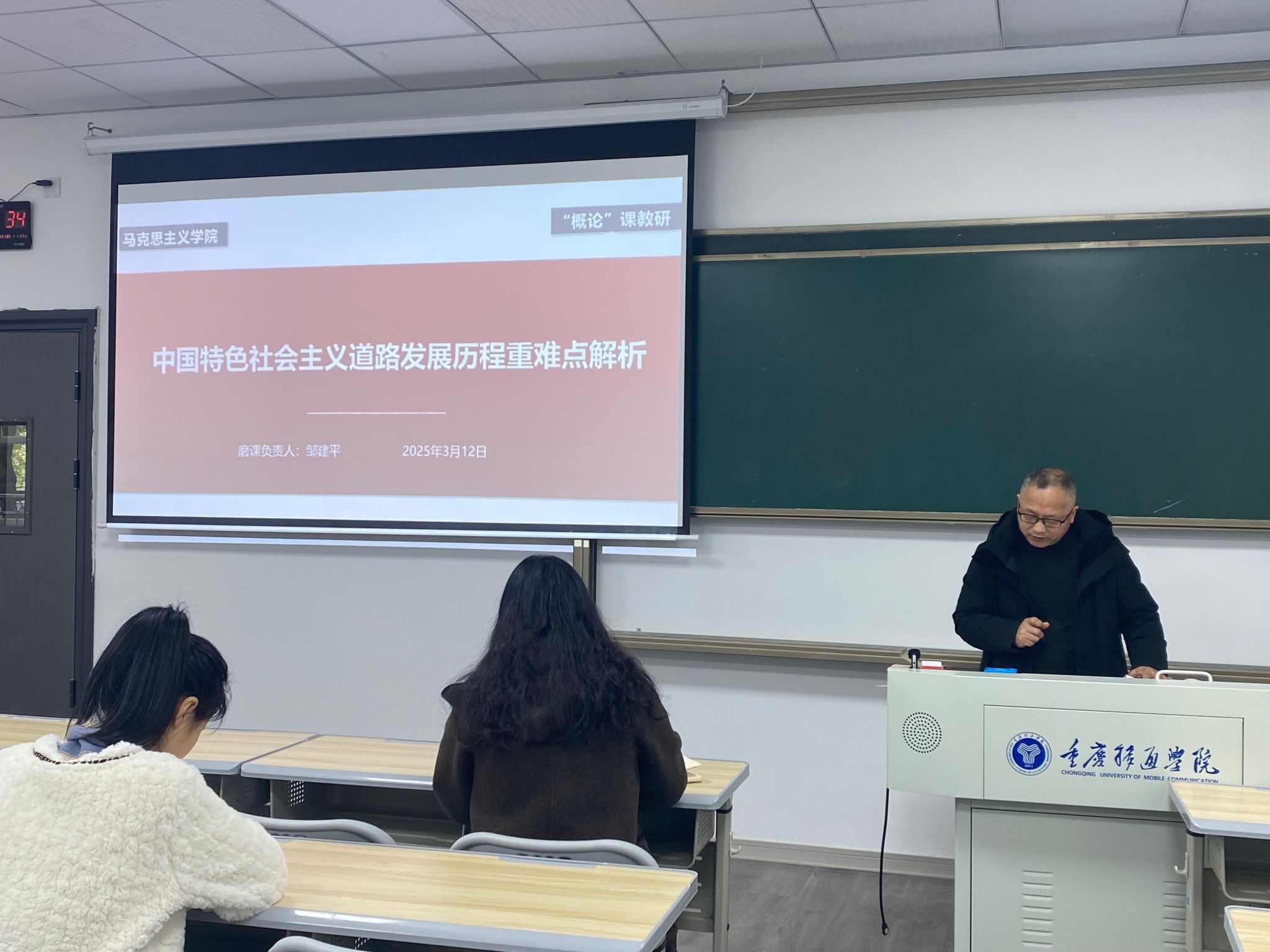 会上,邹老师紧扣“中国特色社会主义道路发展历程”,从历史纵深、理论创新、实践突破三个层面构建教学框架。在讲解过程中,邹老师借助丰富的历史案例,深入阐述了中国特色社会主义为什么是“历史的选择” 和 “人民的选择”,清晰点明中国特色社会主义的社会主义本质属性,详细阐释科学社会主义基本原则在中国特色社会主义中的具体体现和发展脉络,助力教师们对课程理论内涵形成更为系统、深刻的认知。