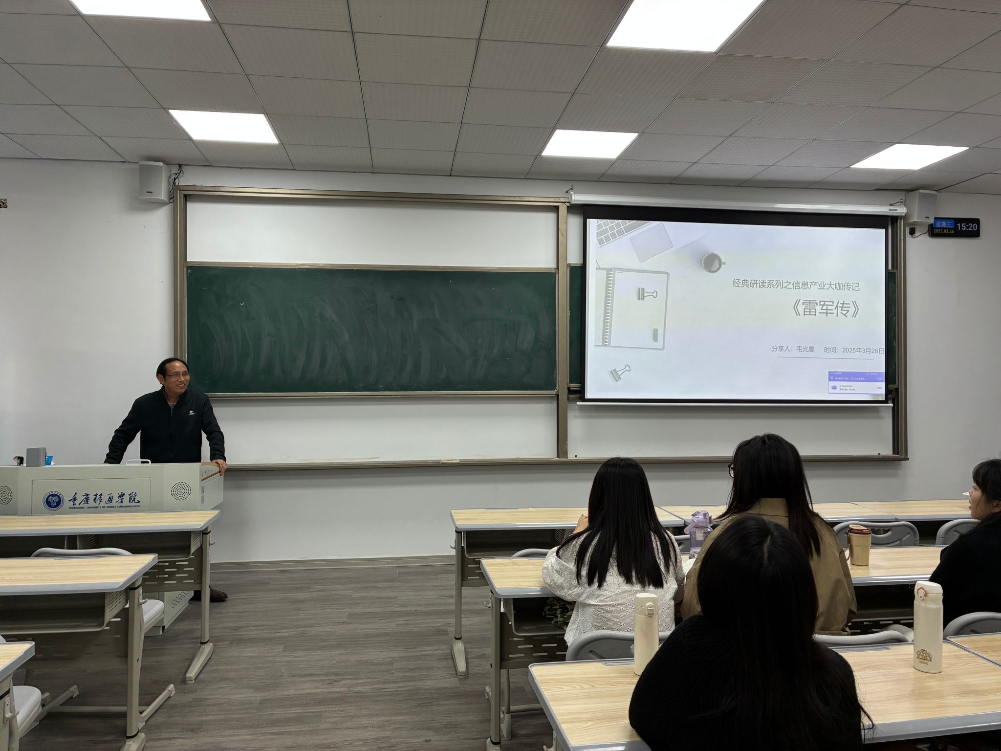 随后,毛老师分享了《雷军传》一书,从雷军的生平到创业经历再到心得体会三个方面对这本书进行了详细介绍。毛老师讲到:《雷军传》以“顺势而为”为核心,展现了一位从程序员到商业领袖的蜕变历程。雷军的故事不仅是个人奋斗的缩影,更折射出中国科技产业发展的时代浪潮。通过阅读,我们能更加深刻体会到他的战略智慧、务实精神与持续突破的勇气。他的故事启示我们:成功并非天赋特权,而是对趋势的敬畏、对目标的执着,以及在逆境中“永远相信美好即将发生”的乐观。正如他在武大班会中所言:“高目标牵引人生,热爱是做好一切的前提。”