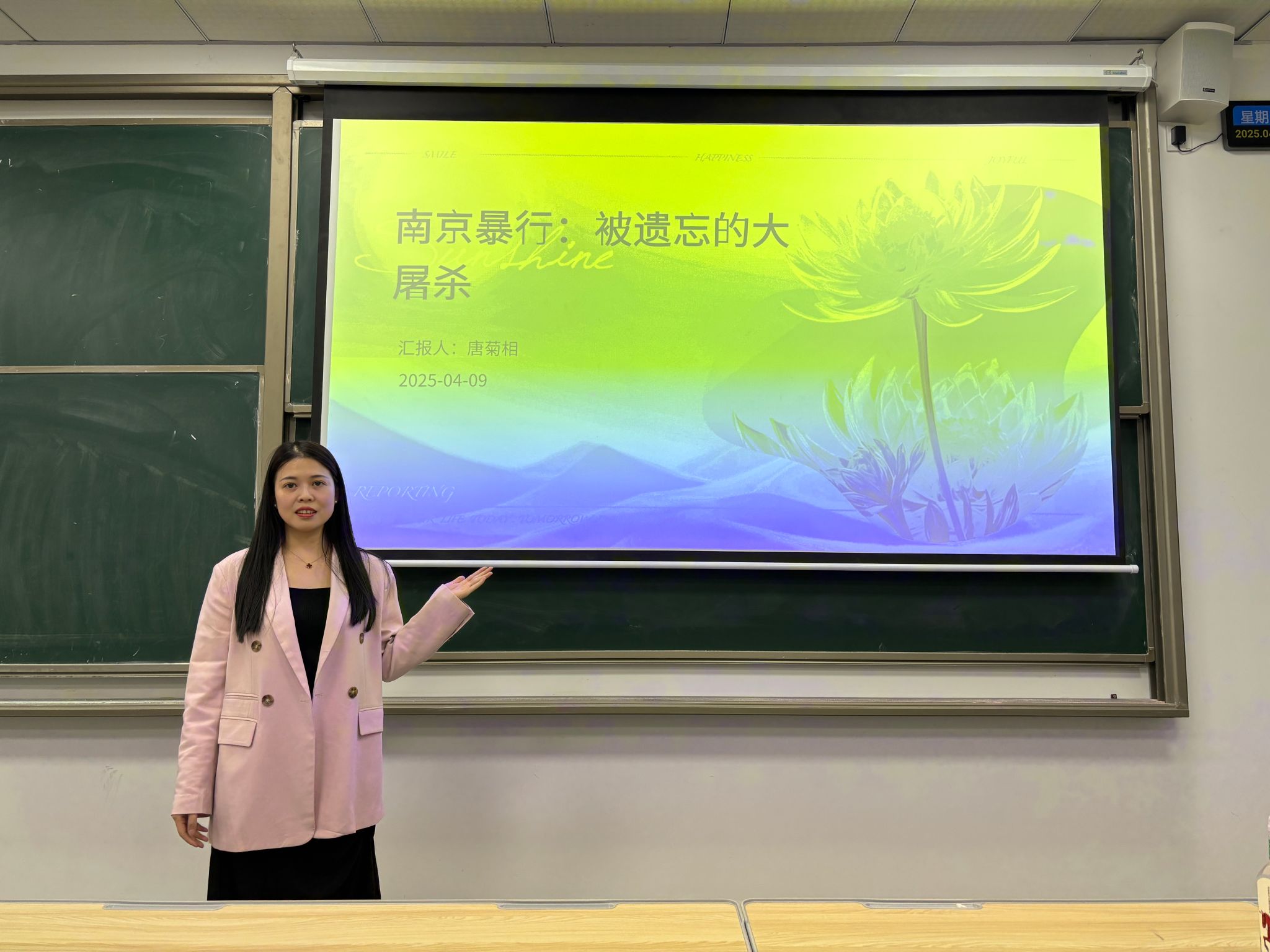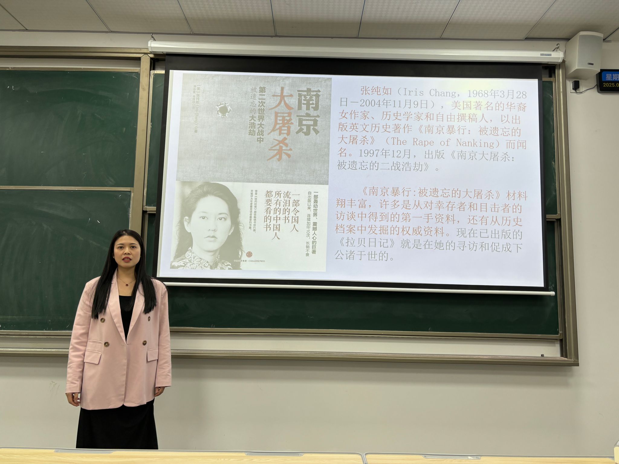 活动中,团队骨干教师唐菊相系统梳理了南京大屠杀的历史脉络,通过历史文献、幸存者口述及加害方记录三重维度,还原事件的复杂性与真实性。她强调,该书在学术上的突破性体现于三方面:一是对日军暴行细节的客观呈现,二是大量引用西方亲历者证言以佐证史实,三是对战后历史记忆建构机制的深刻反思。结合课程教学,唐菊相提出应以“历史的痛感与民族的韧性”为教学内核,运用案例教学法引导学生剖析历史真相被遮蔽的深层原因,培养批判性历史思维。