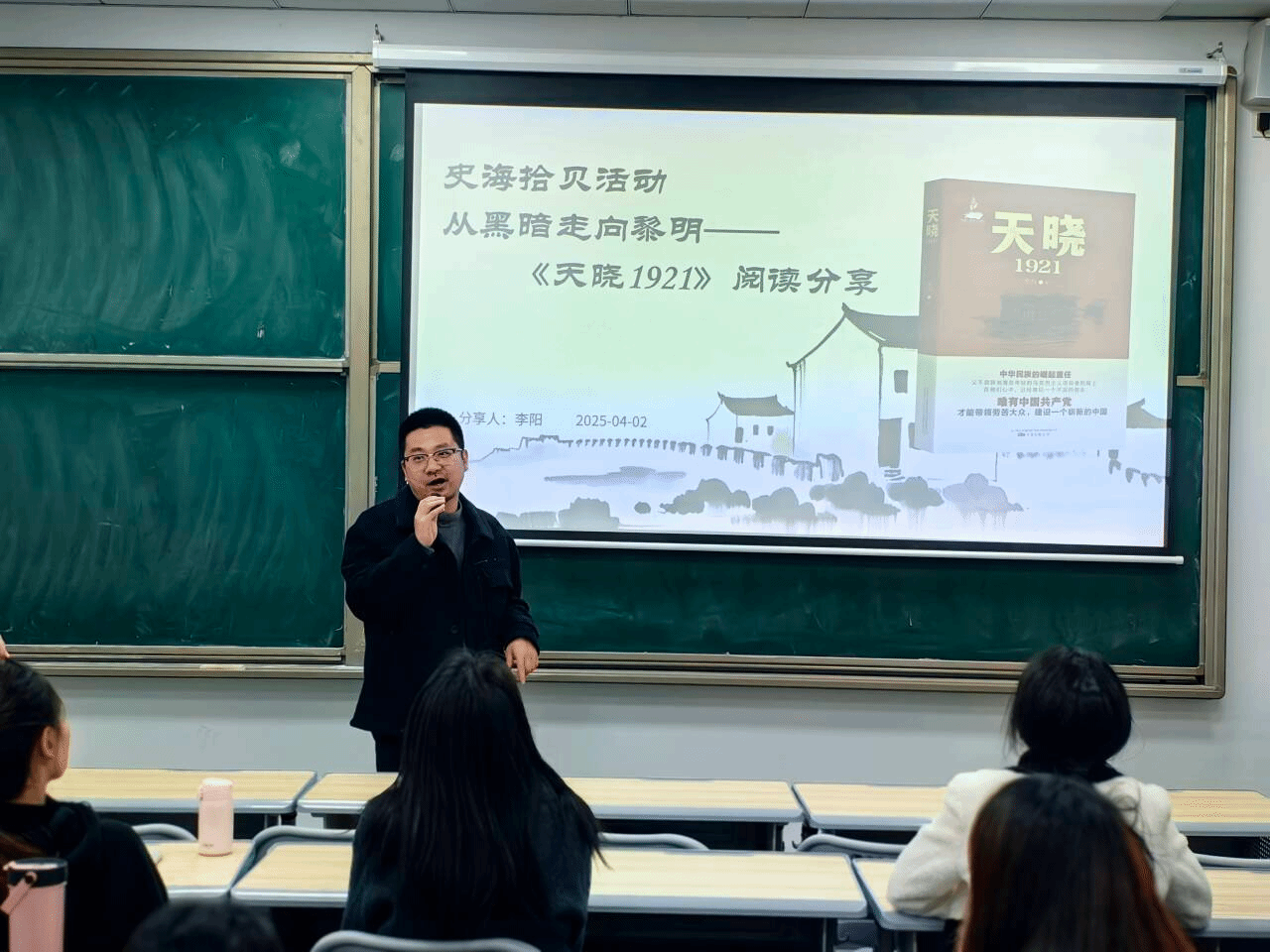 为筑牢思政育人根基,深挖党史资源育人价值,以鲜活史料赋能课堂教学创新,马克思主义学院《中国近现代史纲要》教学团队于4月2日下午在4101教室组织开展了“史海拾贝”读书分享活动。本次活动由李阳老师主讲,以军旅作家徐剑的长篇报告文学《天晓:1921》为切入点,带领团队教师重温中国共产党建党历程,感悟信仰的力量。