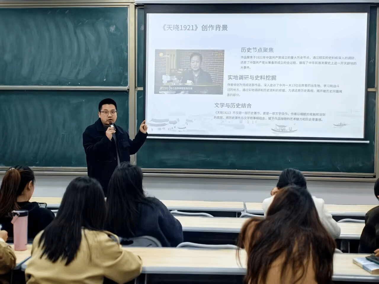 活动中,李阳老师从创作背景、核心内容、思想价值三个维度,对《天晓:1921》进行深入剖析。通过“历史节点聚焦”“人物命运交织”“信仰力量诠释”三大板块,系统梳理了中国共产党创建过程中的关键事件,生动展现了李大钊、陈独秀、毛泽东等革命先驱的理想信念与实践抉择。李阳老师着重强调,该书运用“分镜头式”人物刻画与“全景式”历史叙事相结合的手法,呈现出早期共产党人跨越时空的精神风貌,为新时代思政课教学提供了兼具思想性和感染力的优质素材。