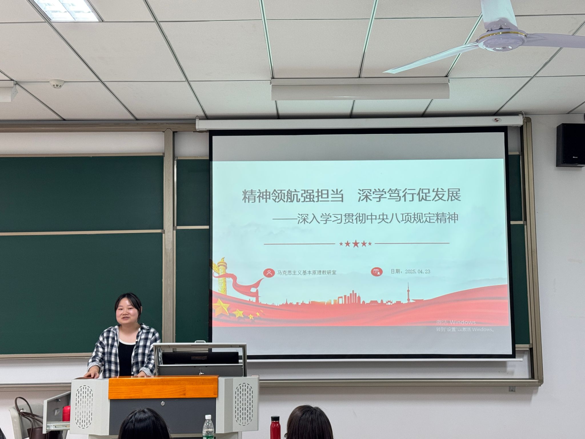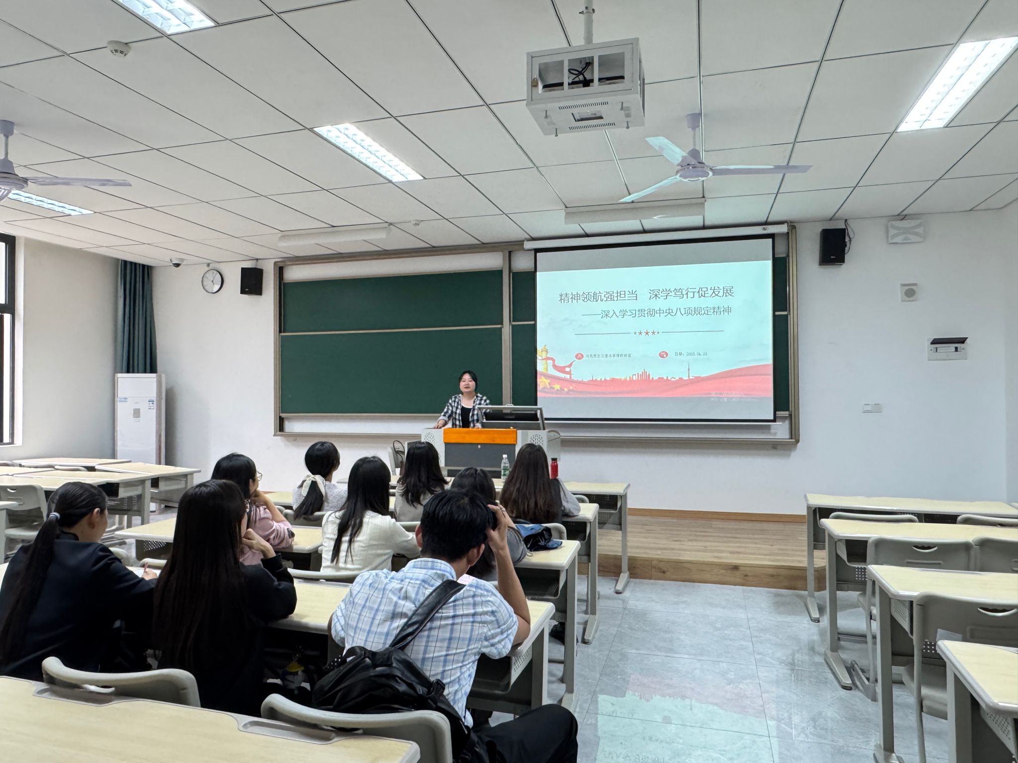 为深化党纪党风教育成果,贯彻落实中央八项规定精神,推进作风建设常态化长效化,2025年4月23日,马克思主义基本原理教研室在行者楼106教室召开深入学习贯彻中央八项规定精神专题学习会。本次会议由教研室主任覃志蓉主持,教研室全体教师参会。
