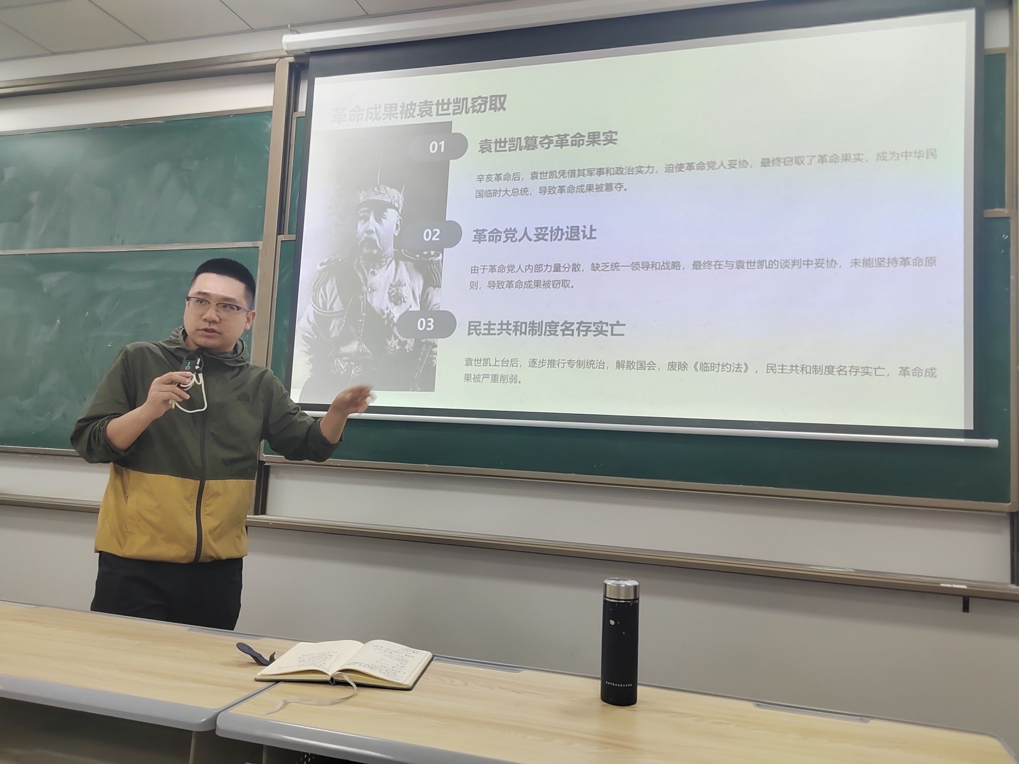 教学展示环节中,李阳老师以历史唯物主义为框架,结合启发式教学、案例分析及模拟辩论等多元化方法,系统剖析了辛亥革命的成功与失败之处。他指出,辛亥革命既终结了封建帝制、确立了民主共和的法治根基,成为近代中国政治转型的里程碑,又因未触及封建经济根基、缺乏群众广泛参与,导致革命成果被军阀篡夺,反帝反封建目标未能彻底实现。为深化理论认知,李阳老师创新设计“史料辨析—矛盾解构—价值凝练”三阶教学路径,通过《临时约法》文本分析、革命纲领矛盾探讨等环节,引导学生辩证思考历史事件的复杂性与多面性。