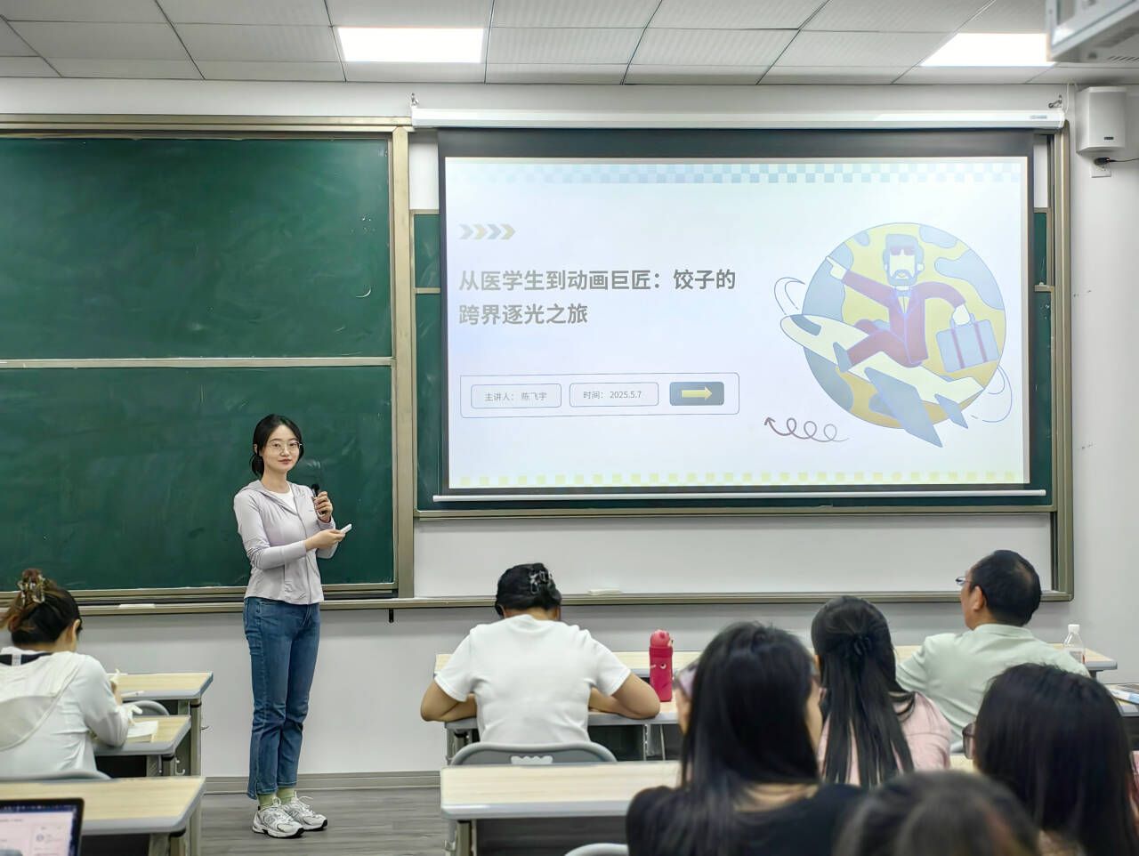 为探索跨学科育人创新路径,推动信息产业大咖阅读计划走深走实融,2025年5月7日14时,马克思主义学院中国近现代史纲要教研室在4103教室举办了最新一期信息产业大咖阅读分享活动。由陈飞宇老师带来“从医学生到动画巨匠:饺子的跨界逐光之旅”的主题分享。陈老师以国产动画导演饺子的成长历程为视角,系统剖析其跨界突围的底层逻辑,为创新人才培养的思政路径提供全新启示。