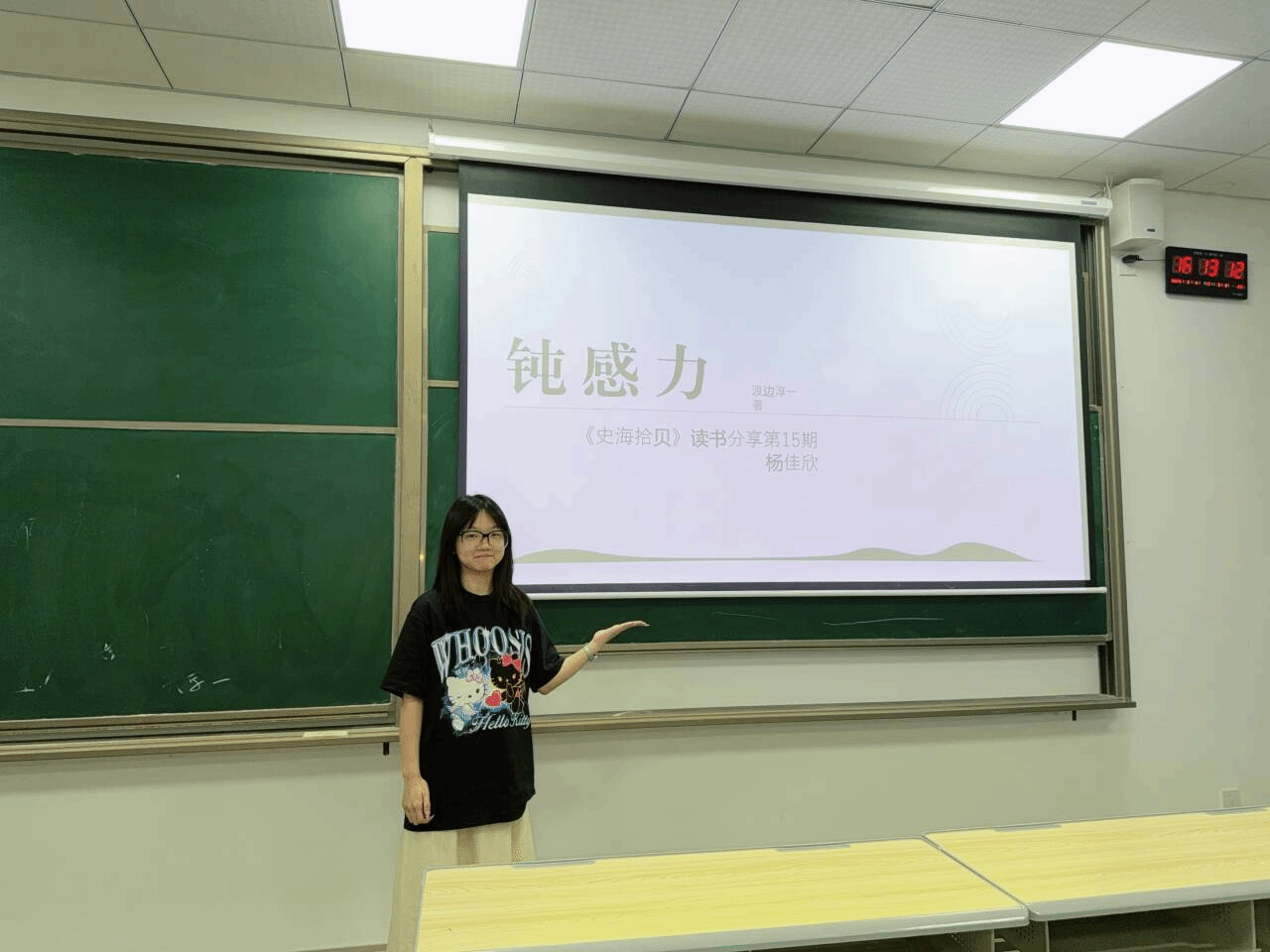 结合书中观点,杨佳欣老师分享了自身在教学实践、职业坚守以及科研定力中所体会到的“钝感力”的现实价值。她表示,作为思政课教师,常常面对学生质疑、课堂上的复杂情境乃至外部评价等情况,在这种背景下,拥有适度的“钝感”不仅有助于有助于教师稳定情绪,聚焦教学内容,还可以在多元评价体系中保持教育初心,避免因外界干扰偏离育人核心,同时也能辅助教师在学术探索中耐住寂寞,深耕历史教学研究。