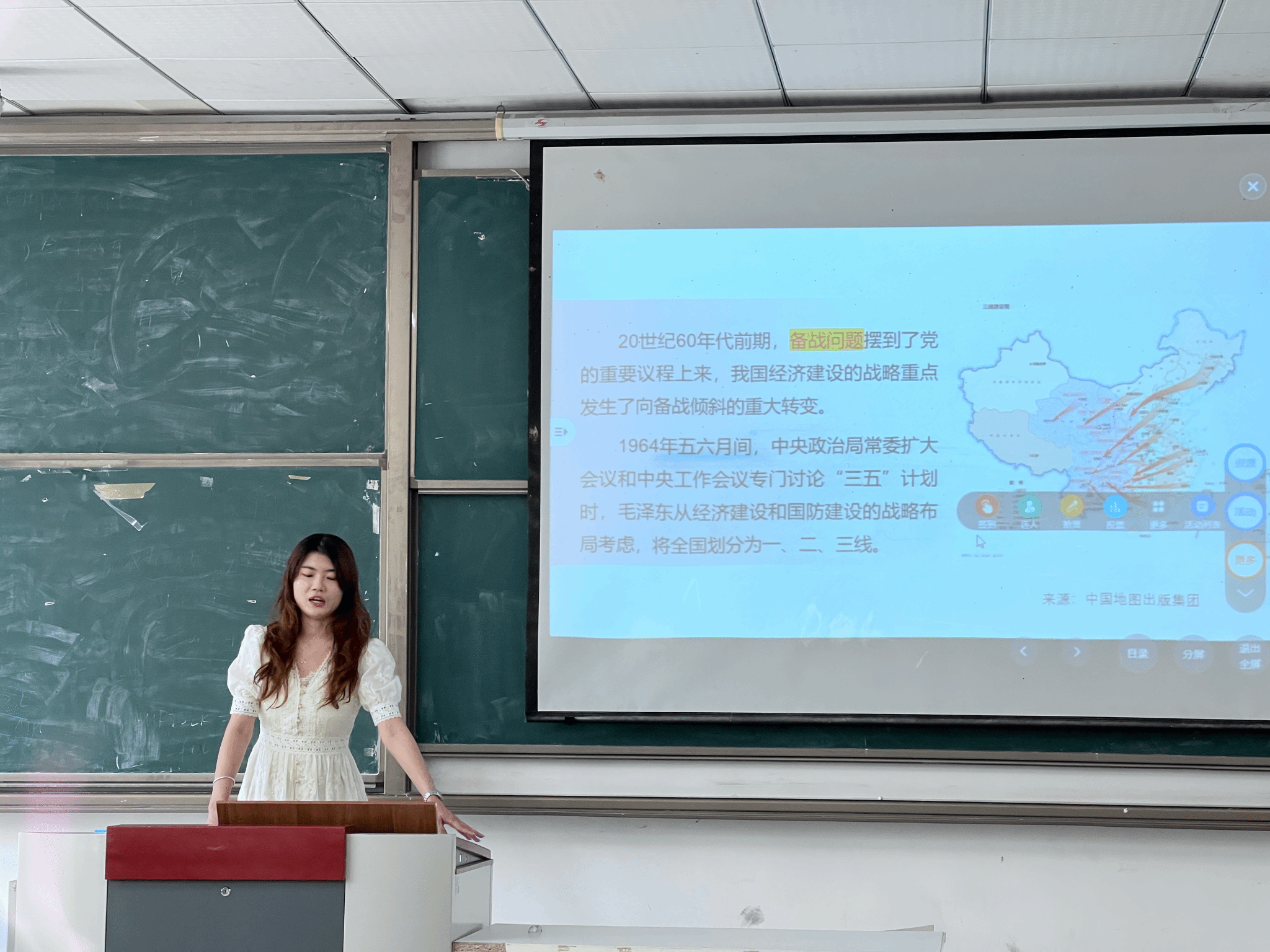 王成宇老师以“三线建设”为主题,从背景、内容、攀枝花案例与三线精神、建设成就四个维度展开。授课前,王老师就学情进行了详尽分析;接着,在讲解三线建设战略布局时,通过播放中央政治局常委扩大会议相关史料视频及战略布局地图动画,直观呈现毛泽东同志从经济与国防建设全局出发划分一、二、三线的决策逻辑;讲述中,以攀枝花钢铁基地建设为典型案例,深入阐释 “艰苦创业、勇于创新、团结协作、无私奉献” 的三线精神,并现场演示智慧教学一体化平台的考勤、提问、讨论、随堂练习等功能。