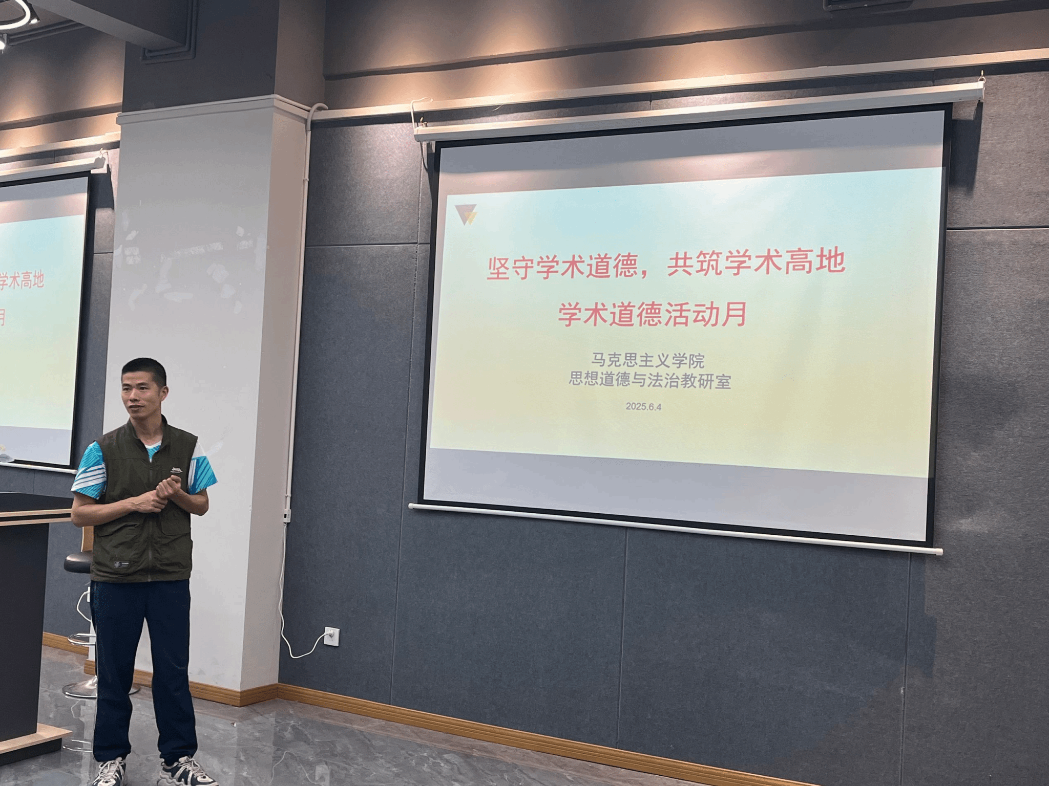 为全面贯彻落实习近平总书记关于弘扬科学家精神、学风建设、科研诚信建设和师德师风建设等指示精神,充分发挥马克思主义理论学科在学术规范建设中的引领作用,2025年6月4日下午,马克思主义学院思想道德与法治教研室在南湖书院声影活动室开展了以“坚守学术道德,共筑学术高地” 为主题的学习活动。本次活动由教研室主任杨勇老师主持,教研室全体教师共同参与学习。