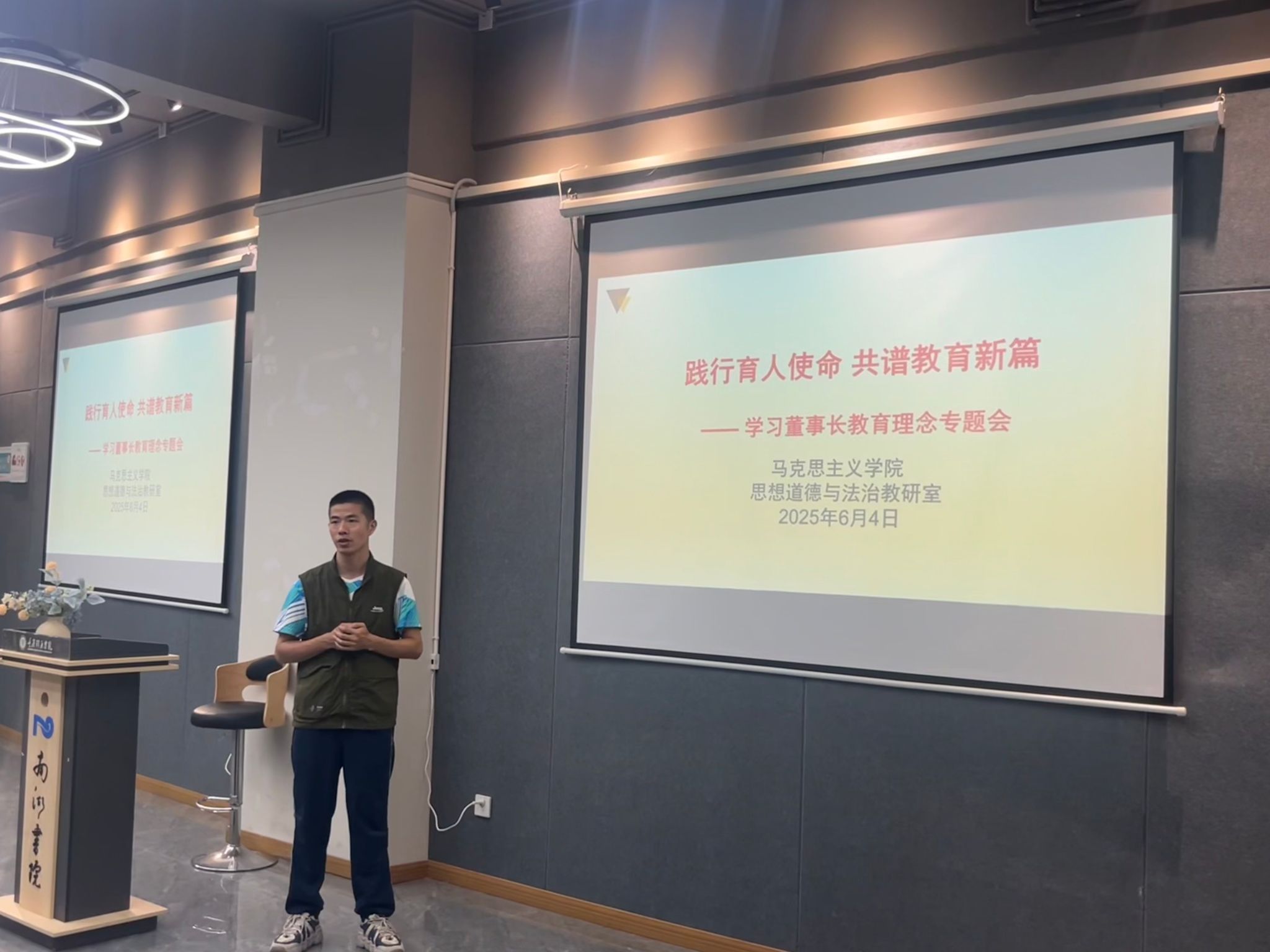 2025年6月4日,马克思主义学院思想道德与法治教研室召开学习董事长教育理念专题会。会议由教研室主任杨勇老师主持,全体教师深入学习探讨董事长关于教育实践的系列理念,结合教育现状与教学实际展开热烈交流。
