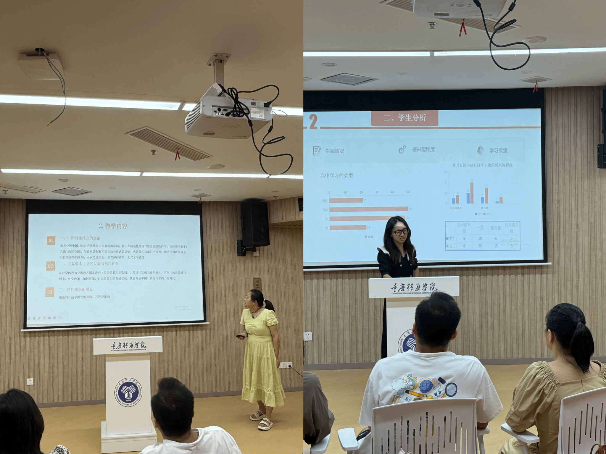 五位教师分别从不同章节切入,展现了丰富的教学思路。罗娅老师以第一章 第一节“鸦片战争的爆发”为重点,从教学内容、过程设计等方面展开,通过史料实证,引导学生理解近代中国社会性质及其特征;彭玉玲老师聚焦第四章第一节“新文化运动和五四运动”,分享了案例教学、情景模拟等教学方法,以五四运动为案例还原历史场景,增强学生代入感;卫峥妮老师以“中国共产党对革命新道路的探索”专题,围绕学情分析、教学重难点以及创新点,设计了历史情境辩论环节,让学生可以通过思考交流提升历史思维与表达能力;段莉老师围绕“鸦片战争前后的中国与世界”章节,从教学目标切入,对鸦片战争前中西方社会经济数据进行对比分析、史料辨析,聚焦培养学生对历史转折节点的认知深度与思辨能力;刘派教师则以“为建立新中国而奋斗”为主题,展示了案例链融合设计,通过整合不同时期的典型案例,深化学生对历史规律的认知。