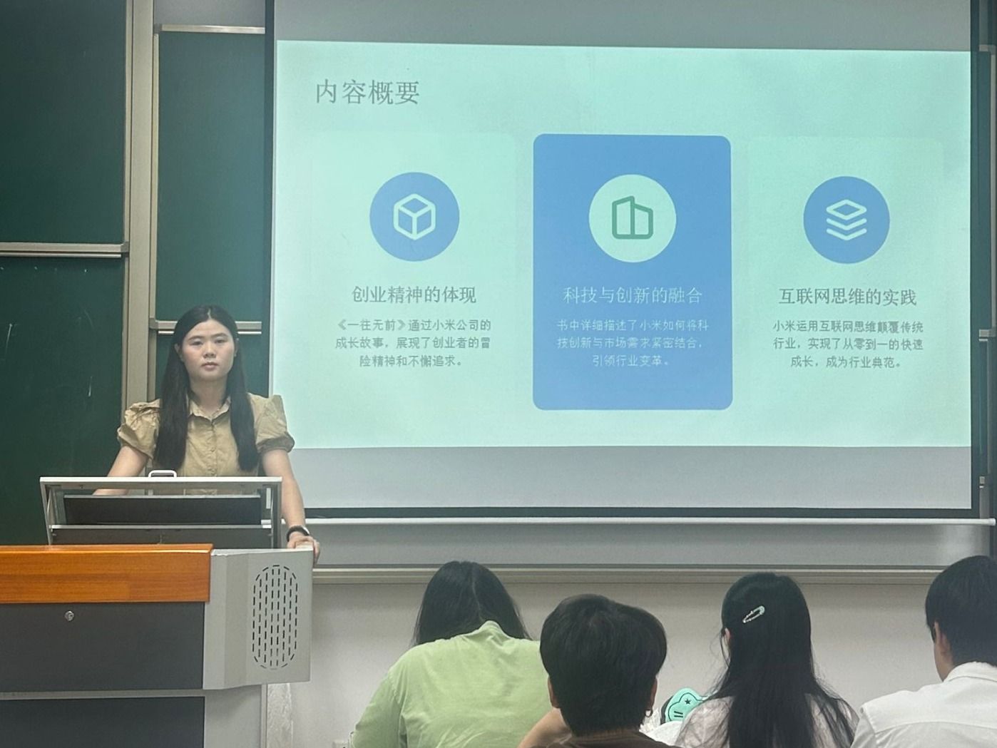 为推动我校“信息产业大咖阅读”计划向更深层次迈进,助力师生开阔视野、汲取奋进力量并内化创新创业精神,2025年9月24日,马克思主义学院罗涵、曾宁栖老师在贤者楼318教室携手2024级动画1班学生,聚焦小米公司创始人雷军从初创到成长为行业巨头的战略思想和创业精神,举办了以“汲大咖养分,踏阅读成长阶”为主题的大咖阅读分享活动。