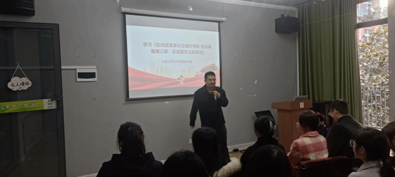 为全面贯彻学习《彭鸿斌董事长在相约书院·校长供膳第三期:征途星河上的讲话》精神,落实学校特色育人模式,耕植教学实践,创新教学改革,中国近现代史纲要教研室于2023年12月6日下午4:20分在花果书院多功能室召开了“董事长讲话精神”学习交流会,会议由教研室主任李阳老师主持,教研室全体老师参加。