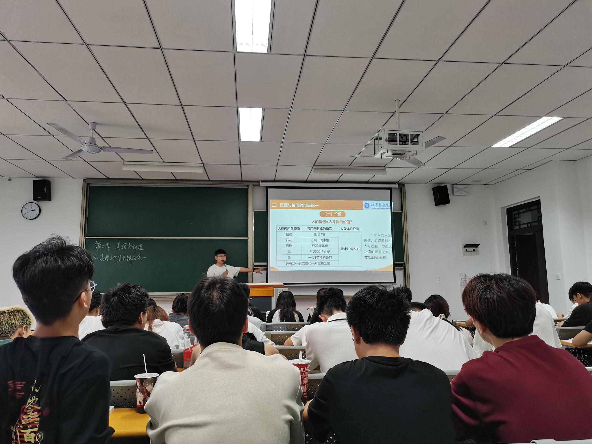 张杨老师此次教学内容是《马克思主义基本原理》第二章第二节“真理与价值”。张老师首先带着同学们一起温习回顾了上节课的教学内容,为本次课学习的新内容作了铺垫和衔接;然后通过国内各高校的校训作为课程导入,带领同学们共同思考各高校校训的含义和价值,吸引同学们的注意力,活跃了课堂气氛,调动了同学们的上课积极性。随后,张杨老师带领同学们一起探讨了“什么是价值”“个人的价值在哪里”“如何进行价值评价”等内容,帮助同学们深刻理解作为青年大学生,要大力弘扬和践行社会主义核心价值观,努力使其成为个人的精神支柱,并在实践中外化为个人的实际行动。