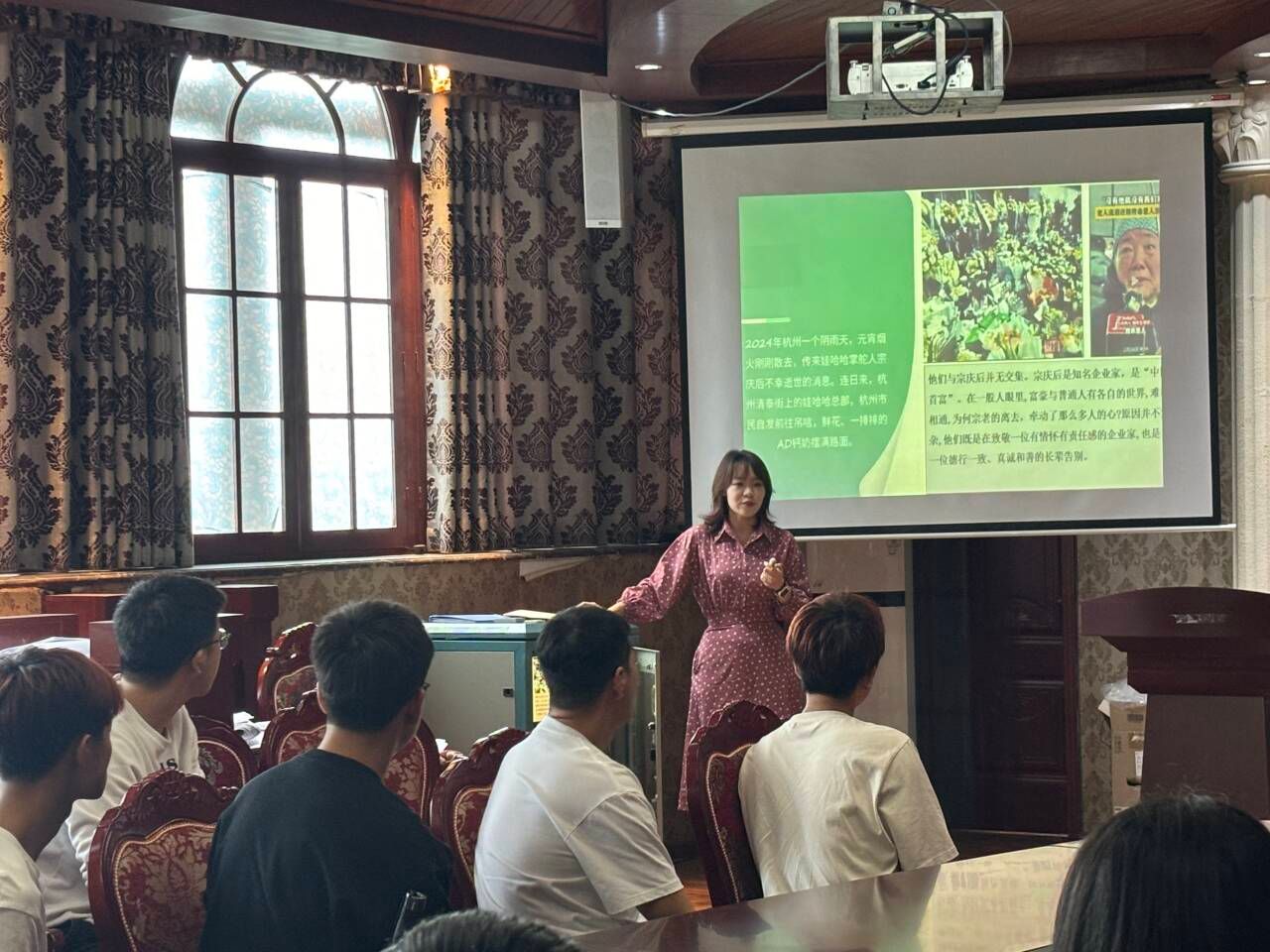在了解了娃哈哈和宗庆后的成功后,徐老师根据在书中节选的内容向同学们讲述了宗庆后在掌舵娃哈哈集团的过程中所面临的曲折和至暗时刻,在20世纪90年代娃哈哈与“太阳神”的齐头并进,但如今“太阳神”已经成为历史记忆,而娃哈哈仍然能够作为国民老品牌占据一定的市场,自然离不开这位民族企业家对市场敏锐的洞察力和对形势的清醒分析。2015年1月,在腾讯微博出现了一条“爽歪歪、娃哈哈AD钙奶等都含有肉毒杆菌,现在紧急召回”的虚假信息,在网络媒体、微博、微信等平台大量转发后,造成广大不明真相的消费者对“爽歪歪”、“AD钙奶”等产品食品安全产生极度恐慌,严重损害了娃哈哈及产品的市场声誉,导致娃哈哈损失超过20亿元,而娃哈哈集团在宗庆后的领导下,对谣言一再澄清,最终真相大白,谣言散布者也当庭道歉。