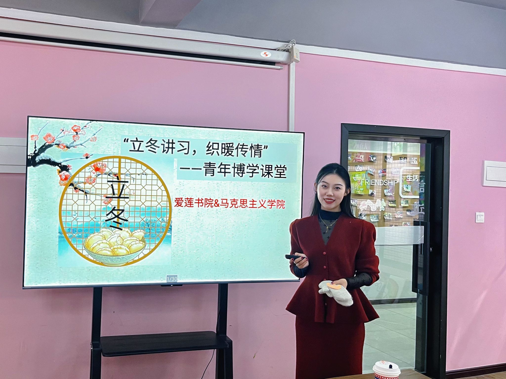 活动在立冬趣味知识分享中拉开序幕。胡春香老师从立冬节气的由来,到其独特的气候特点,从丰富多样的传统习俗,到顺应时节的养生之道,再到优美的节气诗词,均作了详细的分享。丰富的知识如同璀璨珍珠,串联起同学们对立冬的全面认知。这不仅是知识的传递,更是对传统文化瑰宝的传承,让年轻一代在现代生活中与古老智慧相遇。