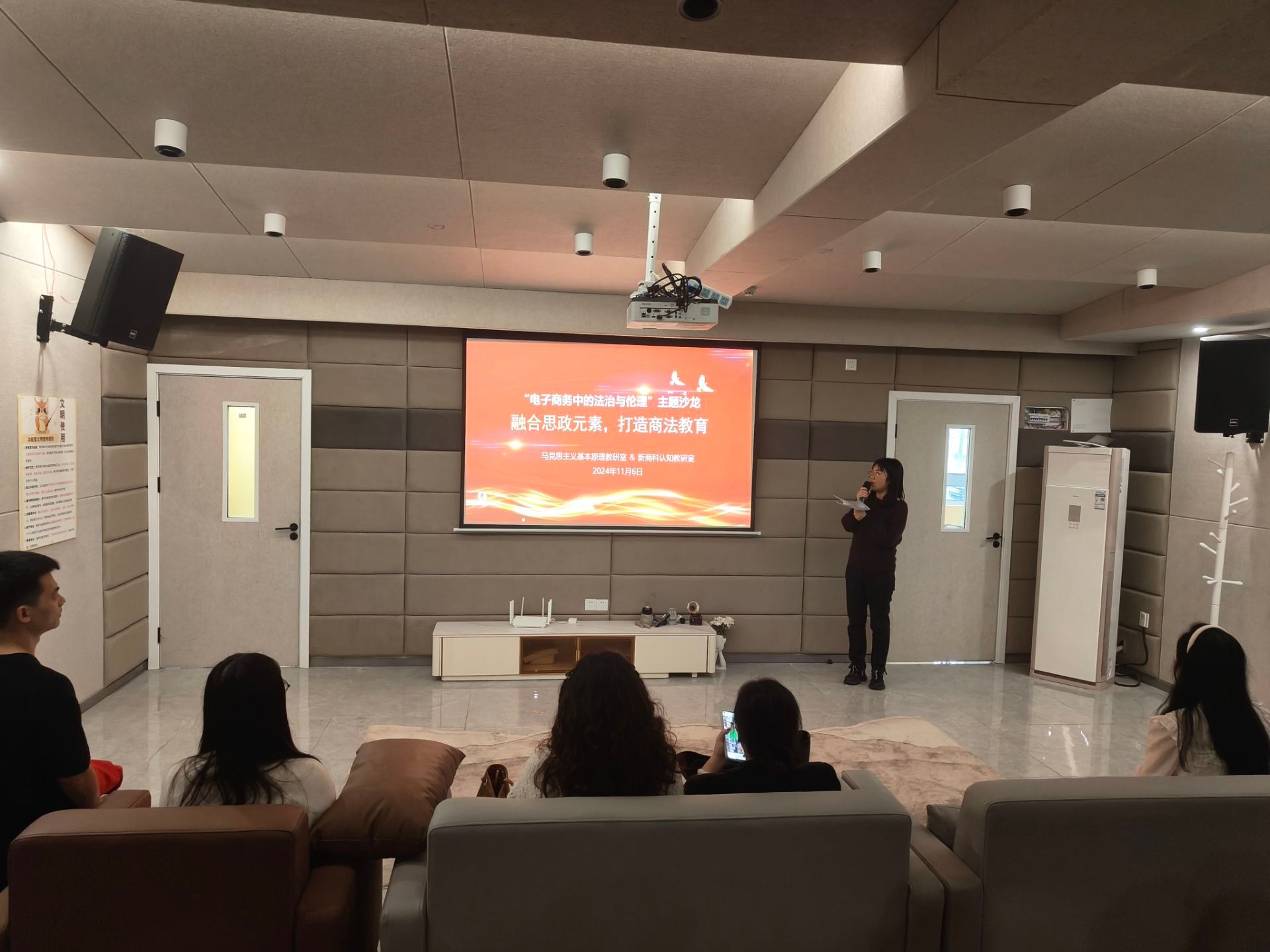 为深入贯彻落实《全面推进“大思政课”建设的工作方案》和《高等学校课程思政建设指导纲要》等文件精神,进一步推进思想政治教育与商科教育的深度融合,推动思政课程与课程思政协同育人。11月6日下午,马克思主义学院马克思主义基本原理教研室与新商科教学部商业基础课程教研室,共同举办了“电子商务中的法治与伦理”的主题沙龙活动,两个教研室部分教师代表和来自不同专业的10名学生代表参加了此次活动。