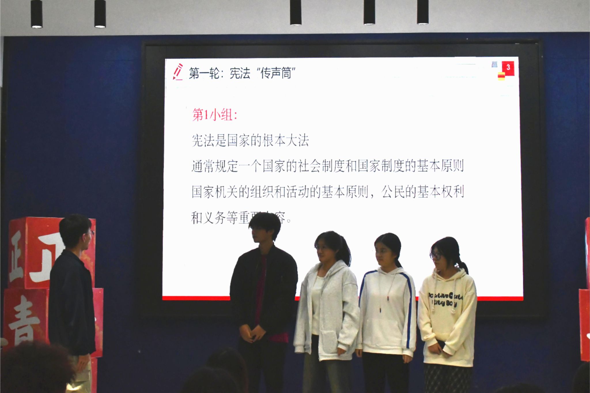 活动分为两轮进行。第一轮以宪法“传声筒”游戏的形式拉开序幕,同学们采用小组合作的方式,既考验了团队协作能力,又能够展现出出色的应变能力;第二轮则更加紧张激烈,同学们需面对更为复杂和深入的宪法问题,进行宪法知识问答,考察了同学们扎实的宪法功底和对宪法知识的综合运用能力。经过激烈角逐,最终由第2小组凭借出色的表现荣获冠军,第1小组和第3小组分别获得亚军和季军。