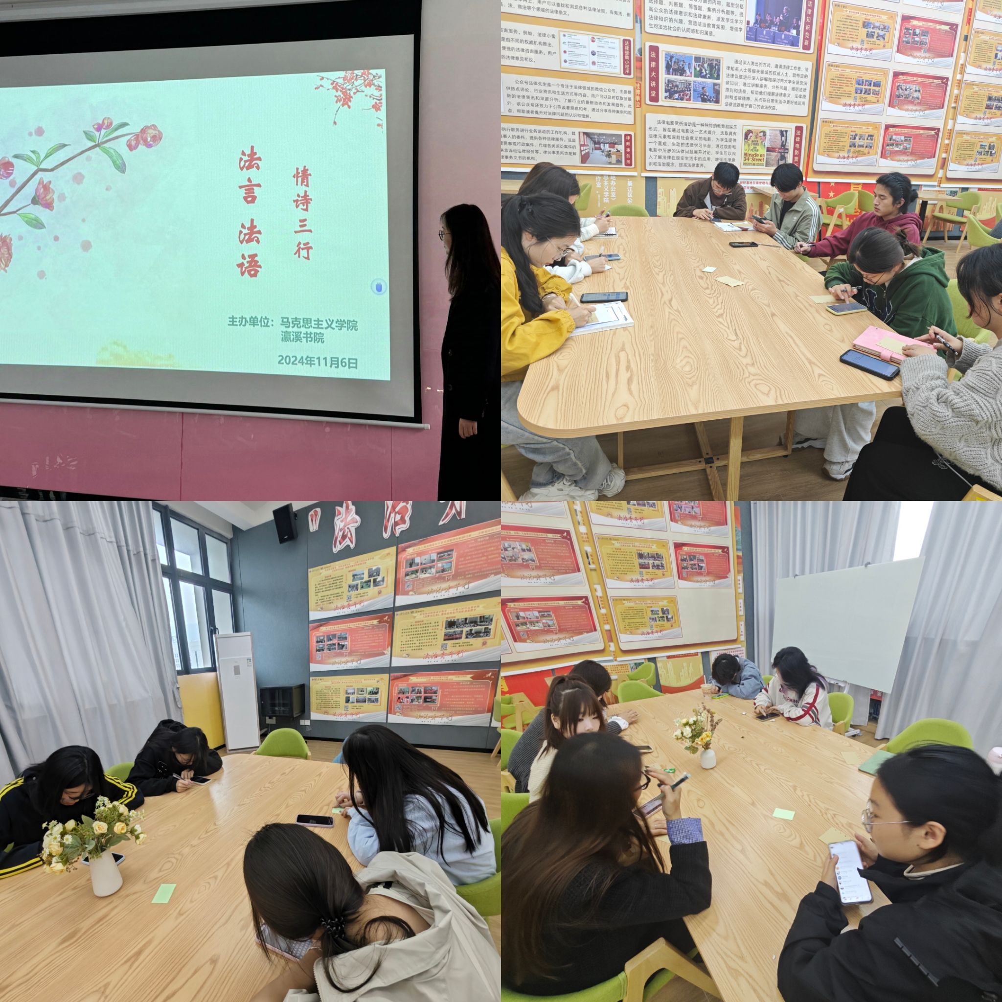 为提供情感交流的平台,提升学生对法律学习的热情,马克思主义学院联合瀛溪书院开展法治三行情诗活动,通过引导学生应用法律相关术语创作三行情诗,叩开“法律之门”,在浪漫中与法律相遇。本次活动于2024年11月6日在瀛溪书院窝在自习室开展,马克思主义学院叶合柳、廖倩荣老师组织,陈蓓贝、邓仁满等20余名同学参加。