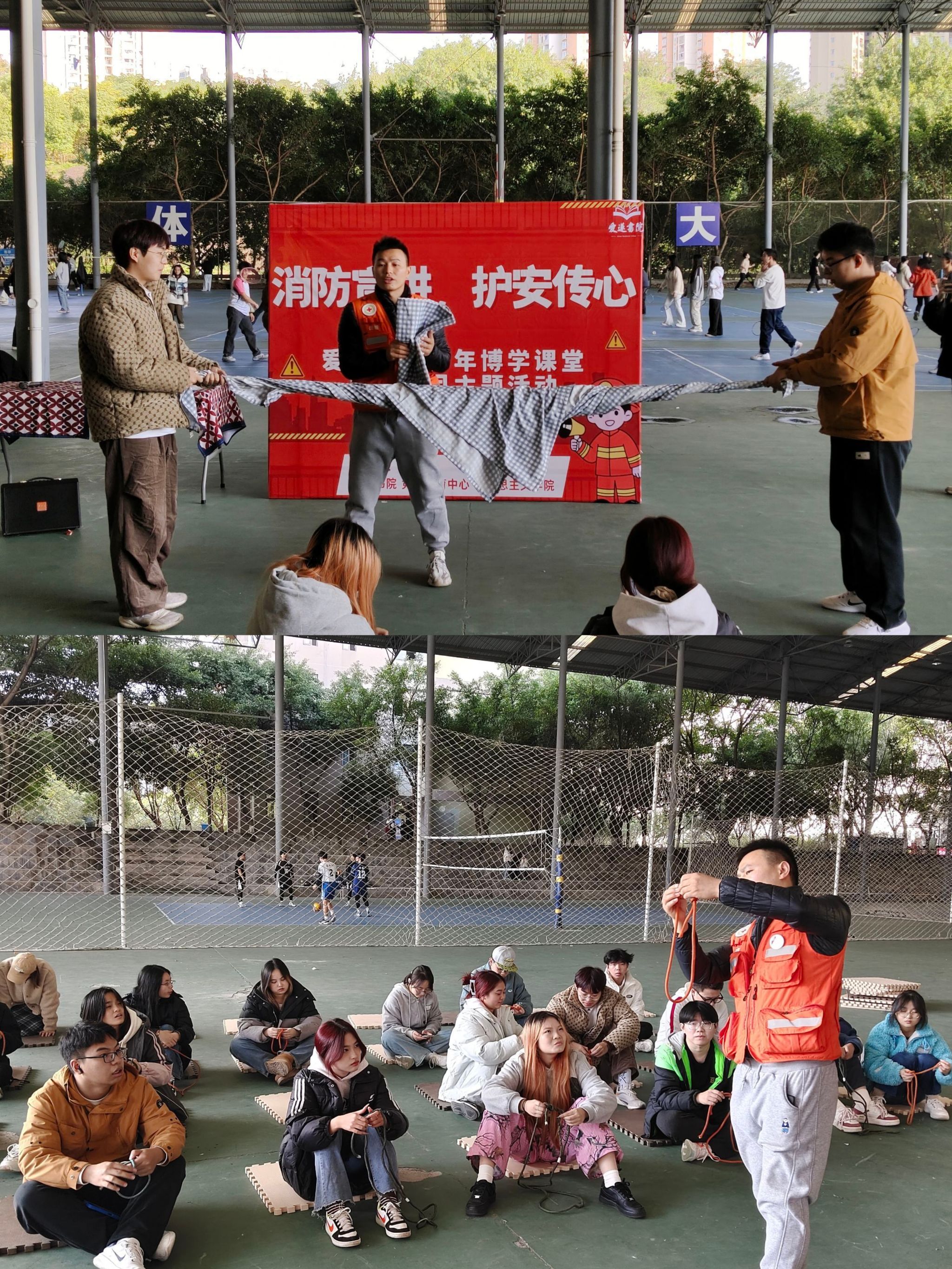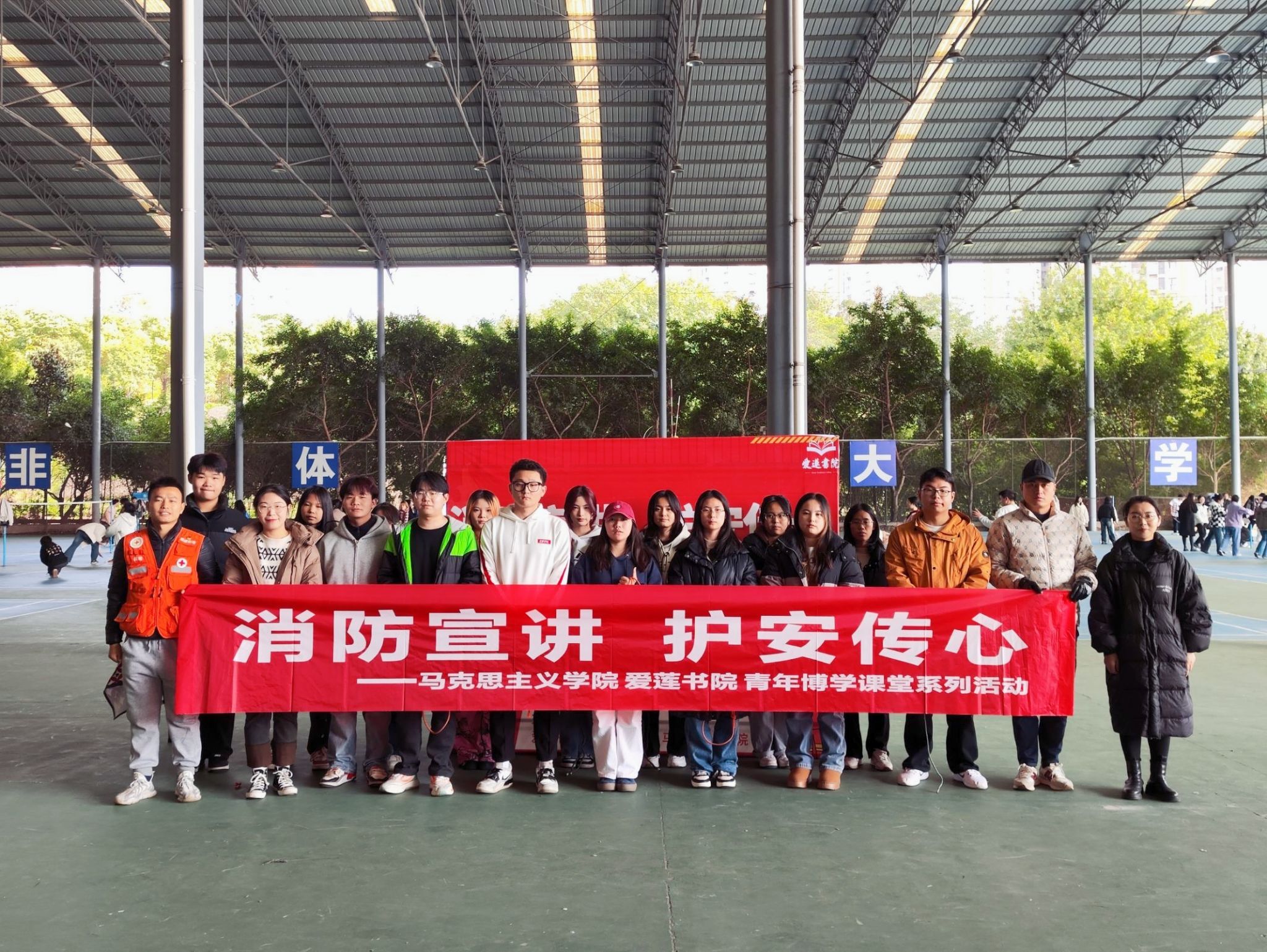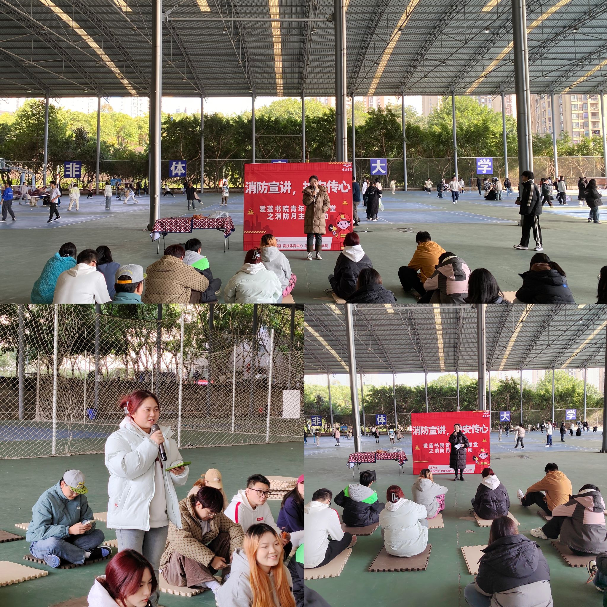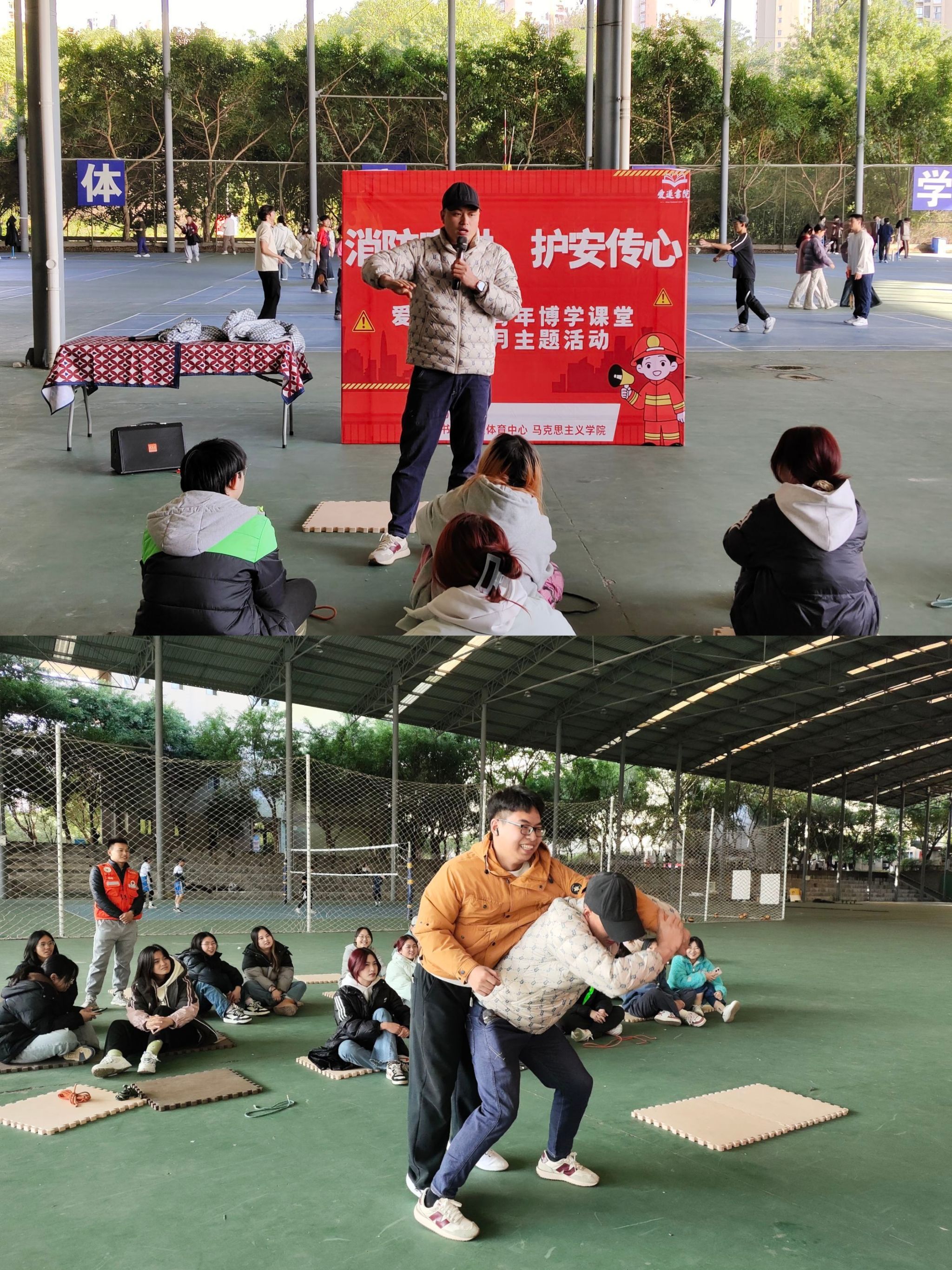 为切实增强师生消防安全意识,提升应急逃生和自我防护能力,构筑安全和谐的校园环境,2024年11月27日下午14:30分,我校马克思主义学院、爱莲书院、竞技体育中心在北校区风雨篮球场联合开展了一场别开生面的 “消防宣讲 护安传心”校园宣讲活动,为校园安全筑起一道坚固屏障。本次活动由马克思主义学院靳银霞、李潇潇老师主持,竞技体育中心及爱莲书院师生代表共计20余人参加。