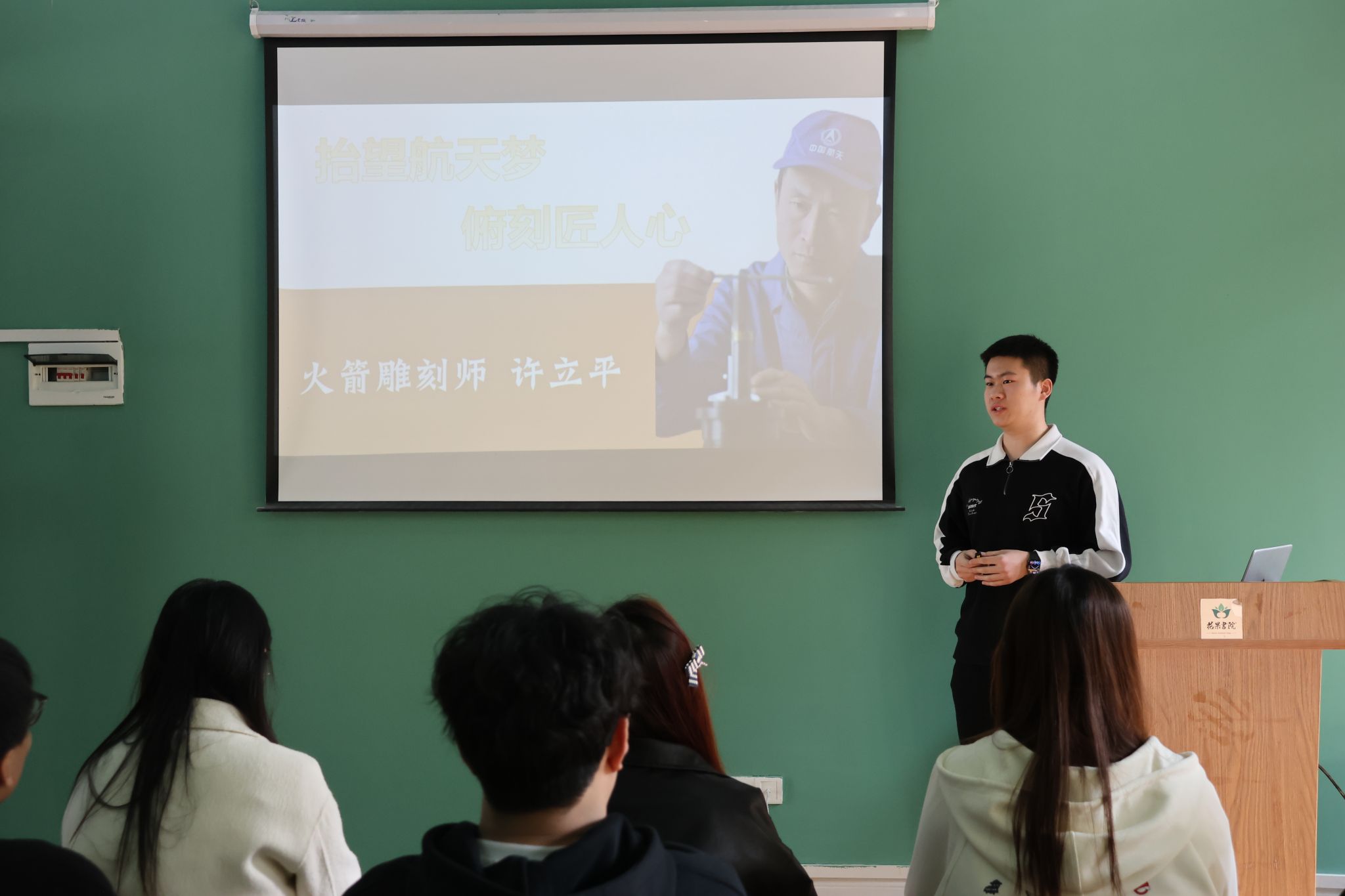 随后,远景学院的李佳伟同学为大家带来了关于徐立平的人物事迹分享。徐立平,作为中国航天科技集团公司的一名普通工人,凭借其精湛的技能和无私的奉献精神,在火箭发动机固体燃料药面微整形领域创造了多项世界纪录,为中国航天事业的蓬勃发展做出了重要贡献。该同学通过生动的讲述,将徐立平几十年如一日的坚守与追求展现得淋漓尽致,引发了在场同学们的强烈共鸣。