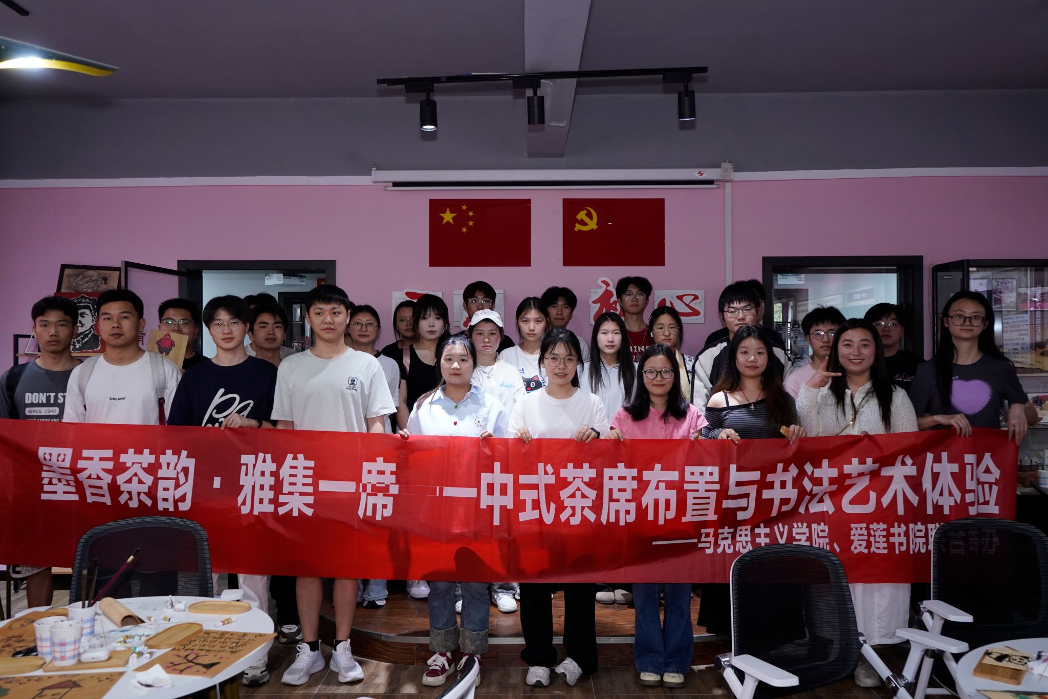 为弘扬中华优秀传统文化,提升学生审美能力,2025年4月16日,马克思主义学院与爱莲书院联合主办的“墨香茶韵·雅集一席——中式茶席布置与书法艺术体验”活动在爱莲书院语言交流室举行,特邀通识教学部陈明波老师,与马克思主义学院的师生们一道挥毫泼墨、烹茶品茗,以“静心修身”体悟中式雅趣。活动由马克思主义学院岳源老师和唐香老师主持,来自全校各院各专业的30多名学生代表参与。