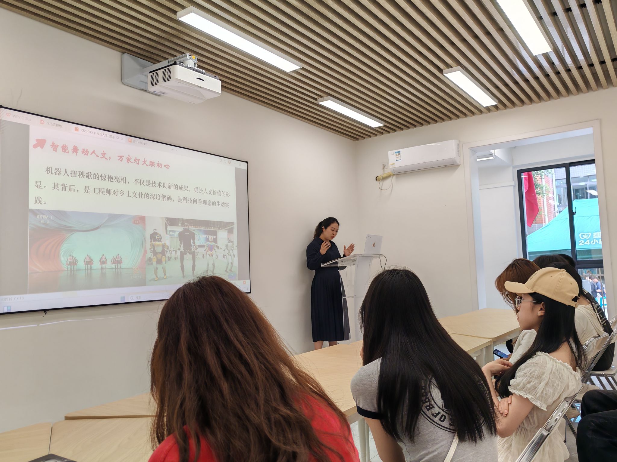 何老师领着同学们首先沿着三个维度展开这场文化解码:一是技术赋能带来的文化新生,二是人文关怀铸就的价值内核,三是文明互鉴指引的未来图景。何老师讲到当智能算法遇见非遗秧歌,看似对立的二者实则在进行一场跨越时空的对话:一边是用激光扫描仪丈量文化肌理,一边是用机器学习预测艺术脉搏;一边是数字技术对文化精髓的精准保存,一边是当代语言对传统表达的创新重构。科技绝非冰冷的工具,而是让文化DNA在新时代完成转录与表达的催化剂,从而助力传统艺术在新时代的土壤中生根抽芽。这种创新更催生出文化生产力的升维跃迁。《秧BOT》的成功实践构建起“技术创新—产业升级—价值转化”的完整生态链。据最新数据显示,节目播出后相关技术已应用于12个非遗项目的数字化保护,带动产业规模突破8.7亿元——这正是新质生产力在文化领域的生动诠释。