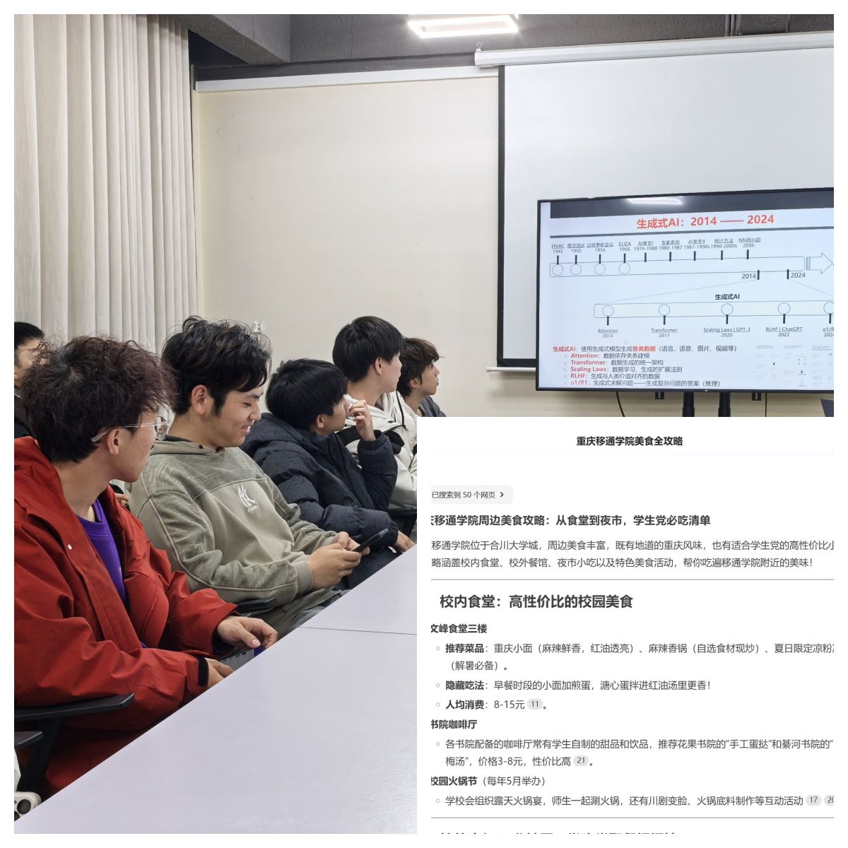 随后,唐菊相老师带领着同学们一起来试验Deepseek的强大功能,组织同学们通过Deepseek搜索学校附近的美食。在Deepseek的指引下,同学们了解到了校内食堂高性价比的舌尖福利;校外周边学生党最佳的聚餐根据地等内容。唐老师围绕试验进一步谈到,当今这个日新月异的科技时代,生成式人工智能技术正以前所未有的速度改变着我们的生活与工作方式。作为新时代的新青年,一方面可以利用Deepseek等生成式人工智能工具,便捷生活;但是另一方面也要理智、客观地看待这一技术的发展与应用。唐老师介绍了当前Deepseek使用中存在的问题,展示了Deepseek的一些出现错误作答,强调人工智能并非万能,不能完全依赖,要注意甄别信息和内容。活动在不知不觉中进入尾声。